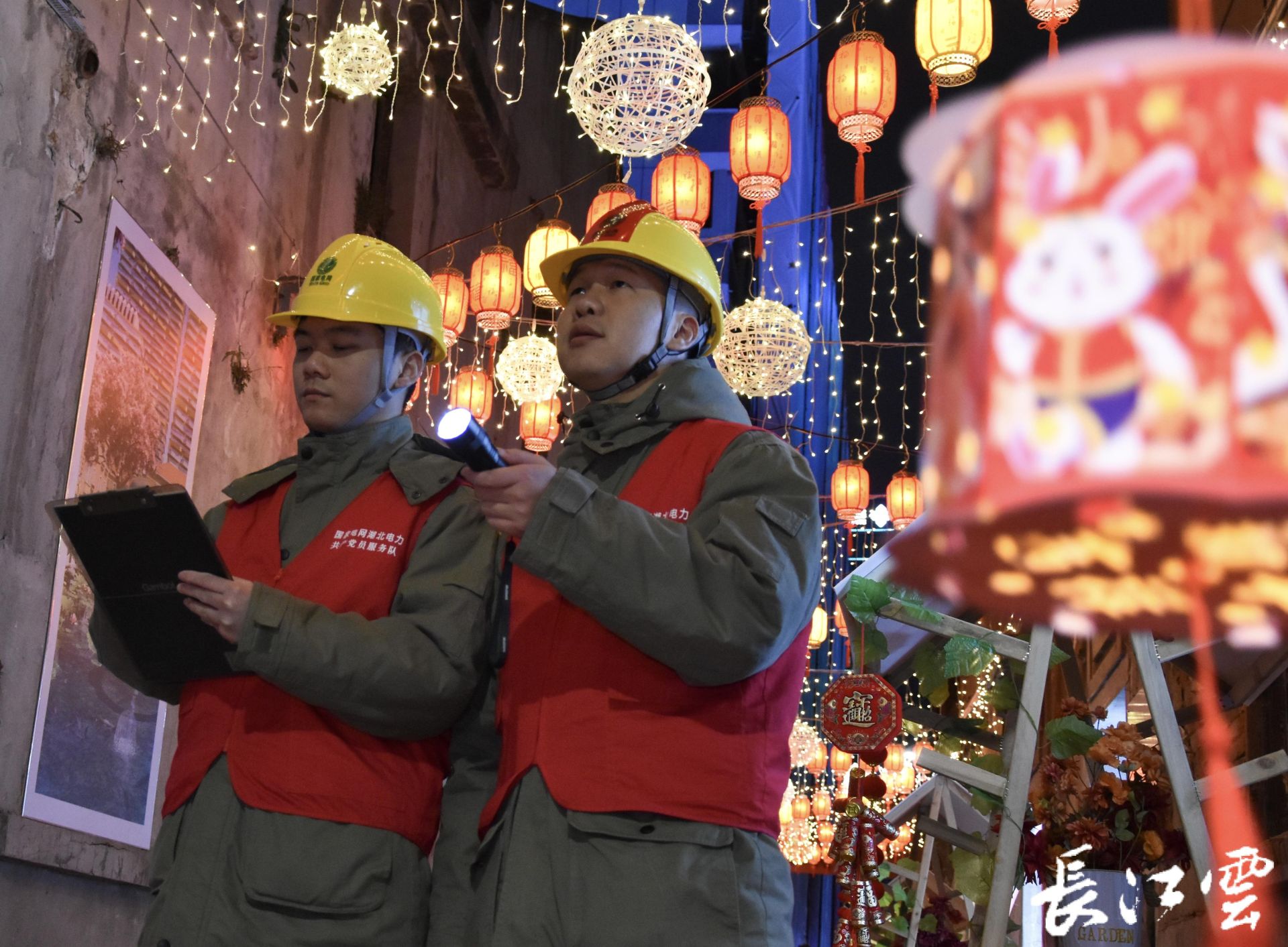 2月4日,元宵活动当晚,国网武汉供电公司汉口客户服务中心车站供电服务站外勤组组长孙玉龙和他的同事来到延庆里检查用电线路,在灯火阑珊中,用他们的方式守护百年小巷里的元宵夜。