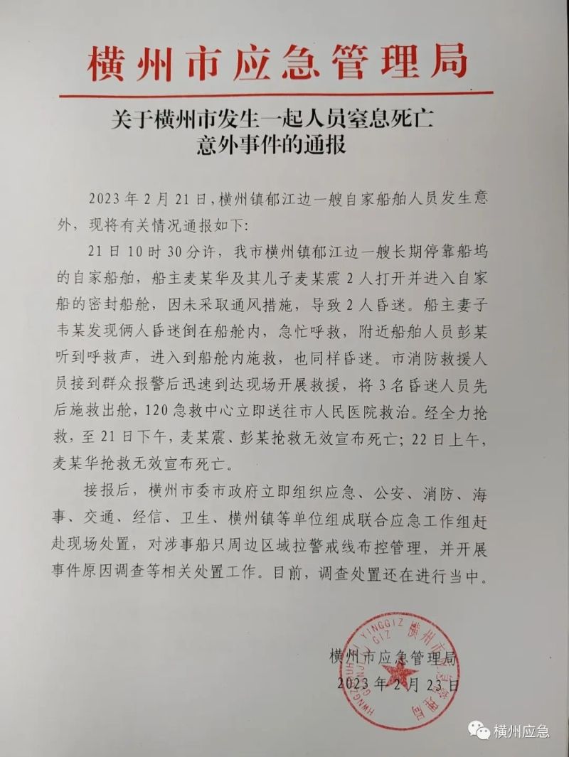 21日10时30分许,我市横州镇郁江边一艘长期停靠船坞的自家船舶,船主麦某华及其儿子麦某震2人打开并进入自家船的密封船舱,因未采取通风措施,导致2人昏迷。船主妻子韦某发现俩人昏迷倒在船舱内,急忙呼救,附近船舶人员彭某听到呼救声,进入到船舱内施救,也同样昏迷。市消防救援人员接到群众报警后迅速到达现场开展救援,将3名昏迷人员先后施救出舱,120 急救中心立即送往市人民医院救治。经全力抢救,至21 日下午,麦某震、彭某抢救无效宣布死亡;22 日上午,麦某华抢救无效宣布死亡。