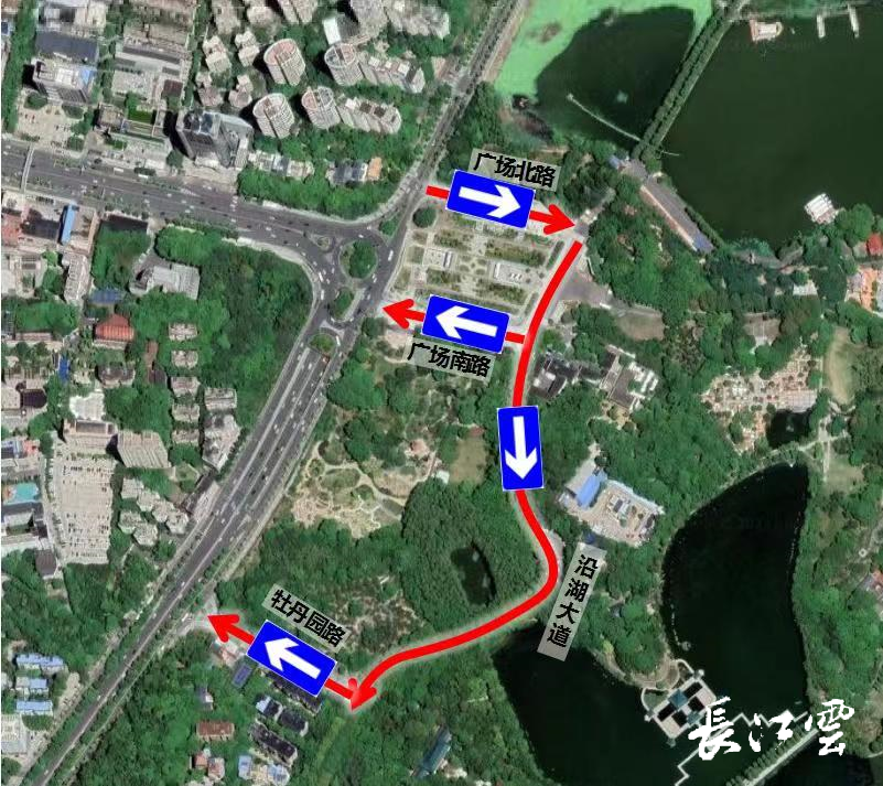 (二)鲁磨路(团山路至植物园路)由南向北(团山路往植物园路方向)、植物园路(鲁磨路至团山路)由西向东(鲁磨路往团山路方向)、沿湖大道(广场北路至牡丹园路)由北向南(广场北路往牡丹园路)、牡丹园路(沿湖大道至东湖路)由东向西(沿湖大道往东湖路方向)实行单向通行。