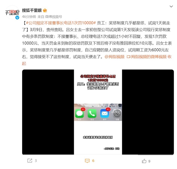 3月10日消息,贵州贵阳吕女士去一家初创型公司试岗第1天发现该公司现行奖惩制度中有多条罚款制度,比如不接董事长、总经理电话1次或超过1小时不回复,发现1次罚款10000元,当天罚金未到账的双倍罚款及下班后椅子没有推回原位扣10元等。