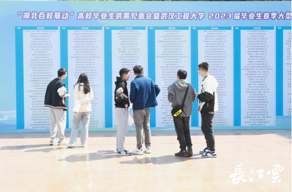 3月15日,“湖北百校联动”高校毕业生供需见面会暨武汉工程大学“江城五校”2023届毕业生联合招聘会在流芳校区知博广场举行。