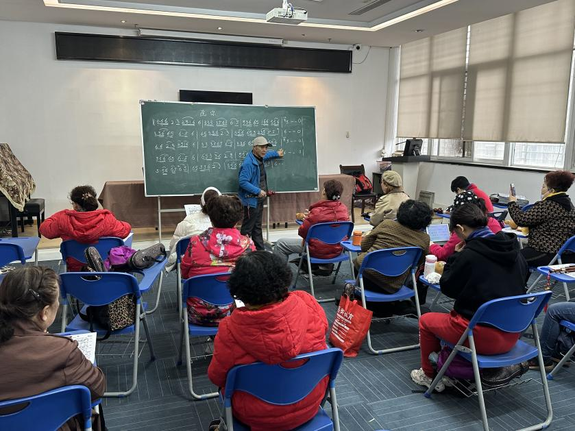 葫芦丝课上,居民们正在学习《画你》的葫芦丝演奏方法,“我年轻的时候就一直想学葫芦丝,因为各种原因一直没有实现,现在社区老年大学终于圆了我的梦想!”