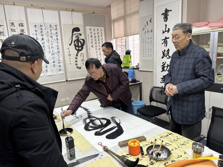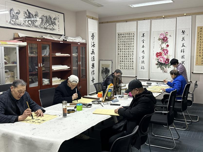在充满墨香的书法教室里,居民们一笔一画认真书写,“这一笔要加一点力道,粗一些。”一边写着,还一边互相交流着书法心得经验。