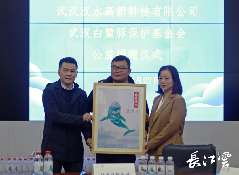 活动现场举行了“我爱汉水”新款——江豚文创款捐赠仪式,从即日起消费者到武商量贩和中百仓储每购买一瓶汉水,都会为武汉白鱀豚基金会捐赠一分钱用于江豚保护公益事业。