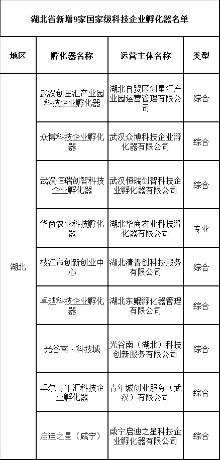 科技部网站信息显示,经地方科技主管部门推荐,科技部火炬中心评审并公示,此次共有194家孵化器备案为国家级科技企业孵化器,湖北有9家孵化器上榜。