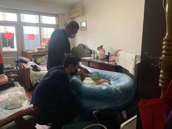 3月11日,助浴团队在北京察慈小区为一名101岁的老人提供助浴服务。(受访者提供)