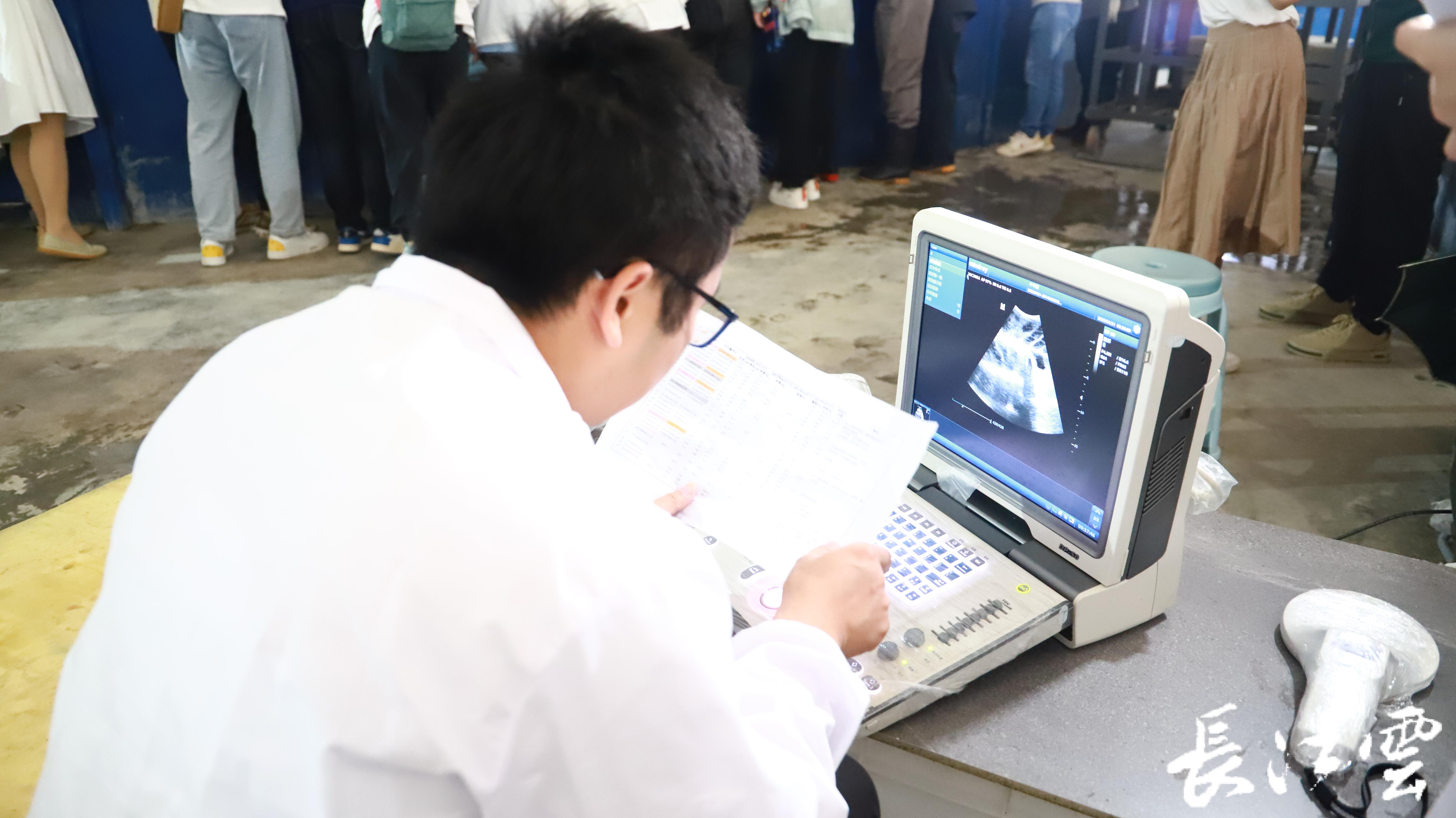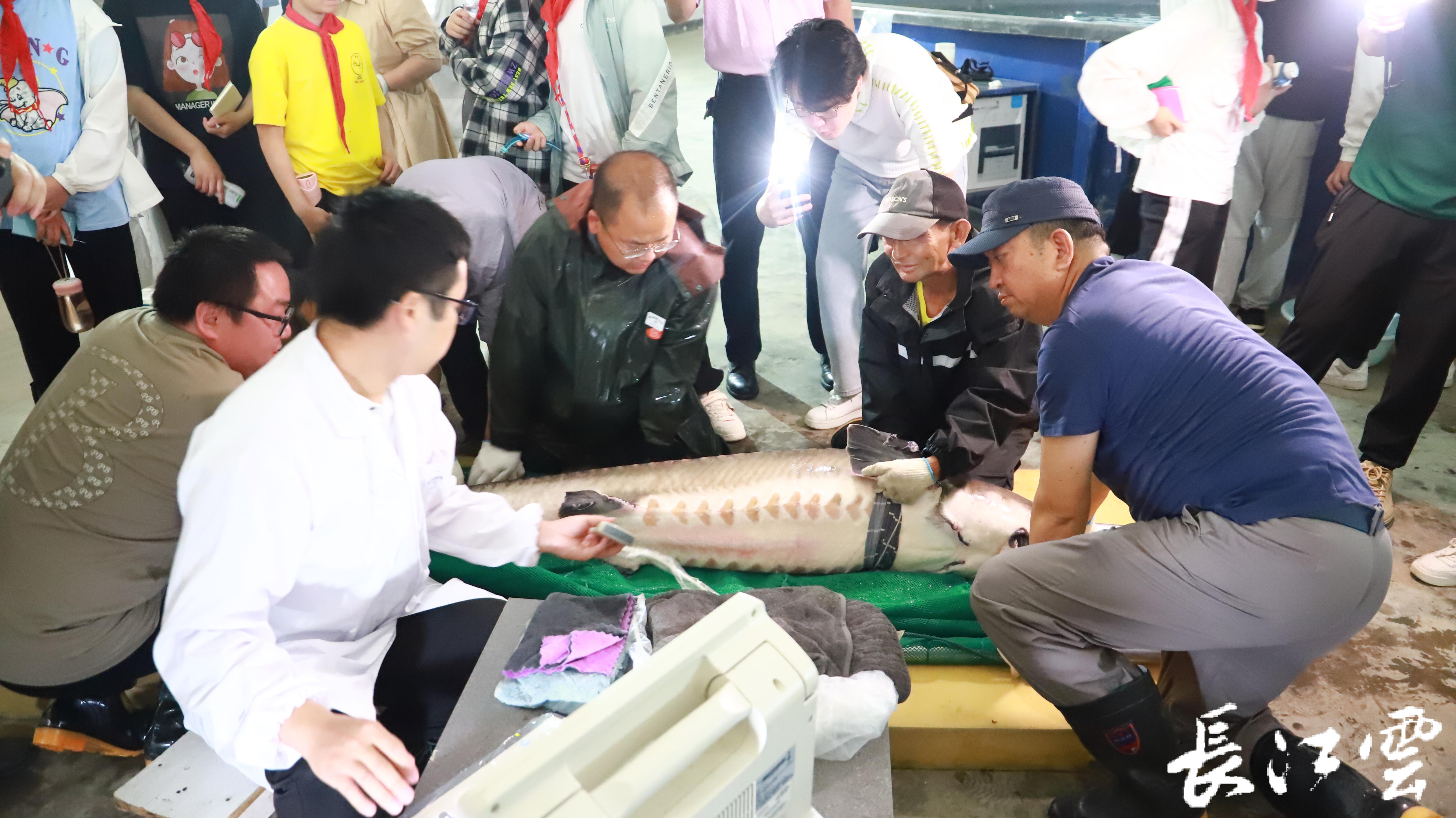 “你看,好大一条中华鲟”,活动现场,大兴路小学学生惊叹到。在上午进行的中华鲟体检现场,专业技术人员对中华鲟亲鱼生长性状进行了测量、身份信息进行了扫描(PIT编码);同时采集了中华鲟亲鱼分子样品。尤其是看到一个技术人员手拿B超仪对中华鲟的肚子进行扫描时,大家都很好奇。据水利部中国科学院水工程生态研究所副研究员田华介绍:这是在为中华鲟亲鱼性腺发育状况做B超检测。男性还是女性,它这个性腺发育到几期,通过此次检测都可以了解到,就像人们去医院做B超一样的。