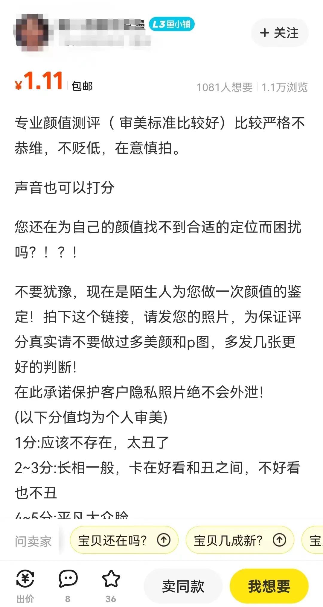 谁来评分?如何打分?记者总结各个购物平台上此类商品信息发现,卖家身份各有不同:有的自称是从业多年的专业化妆师,可从专业角度提供颜值分析服务;有的自称“绝对路人”,强调陌生人视角的颜值评价;有的自称在校大学生,从初恋角度看颜值高低;有的则以异性审美为卖点,自诩“钢铁直男(女)”……他们都宣称自己“客观公正”“不吹彩虹屁”。