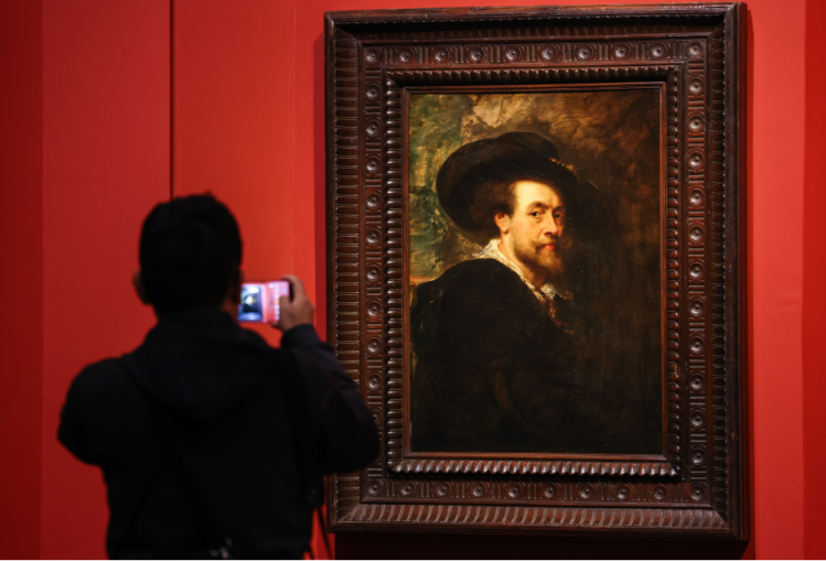 观众可以看图读史。《拉斐尔自画像》是展厅里当之无愧的“c”位。作为文艺复兴三杰之一,画面中的拉斐尔一头栗色头发,戴着一顶黑色帽子。如果仔细观察,“拉斐尔”的双眼没有直视观众,而是看向斜下方。一个眼神,少了一些对视的冲击力,增添了一点恬静柔和的氛围。一脸面容消瘦的老者,挺鼻配络腮胡,手里拿着调色板。他是16世纪威尼斯画坛巨匠提香。顺着展线往前,“弗拉芒画家王子”鲁本斯,才华出众的雕塑家、建筑师、城市规划师和舞台设计师贝尼尼,荷兰历史上最著名的画家之一伦勃朗……艺术家逐一“走”到观众面前。