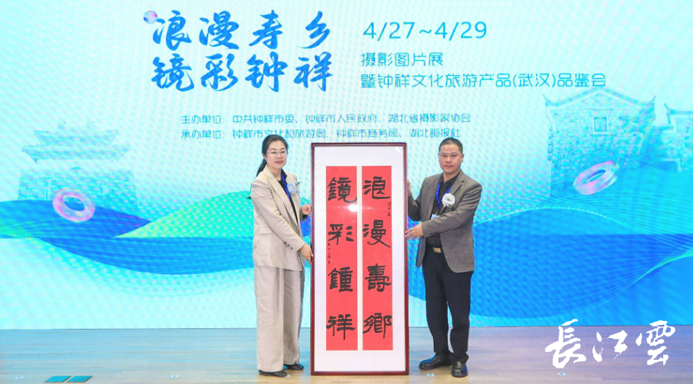 中国书法家协会会员、湖北画报社董事长陈明华向钟祥市文旅局局长郭庆赠送书法作品《浪漫寿乡 镜彩钟祥》,苍劲有力、飘逸自如的作品,写尽了长寿钟祥的诗意浪漫。