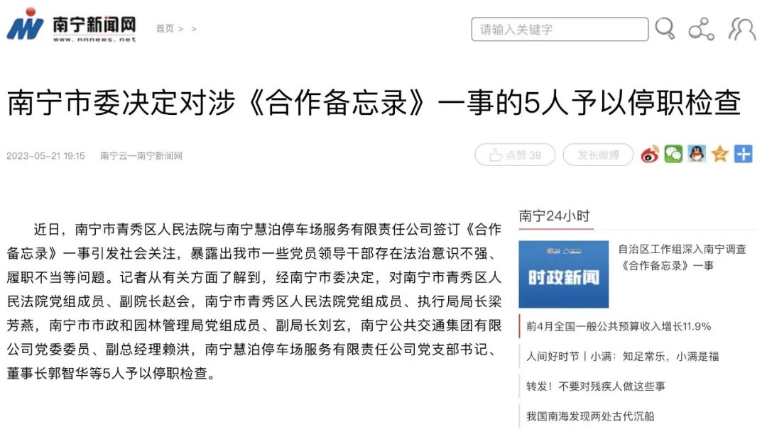 针对网络舆论争议,5月18日,南宁市政府连续发布两则公告,宣布已成立专项工作领导小组,将研究出台优化道路停车收费方案并尽快组织实施。5月19日公开的通报指出,广西壮族自治区高级人民法院对《合作备忘录》内容进行了审查。区高院经审查认为,青秀区法院与特定企业签署合作备忘录不符合公平公正的原则,5月19日已责成青秀区法院与慧泊公司解除了《合作备忘录》。经南宁市委决定,对南宁市青秀区人民法院党组成员、副院长赵会,南宁市青秀区人民法院党组成员、执行局局长梁芳燕,南宁市市政和园林管理局党组成员、副局长刘玄,南宁公共交通集团有限公司党委委员、副总经理赖洪,南宁慧泊停车场服务有限责任公司党支部书记、董事长郭智华等5人予以停职检查。5月21日,自治区党委常委、南宁市委书记农生文和市长侯刚在市内调研路内停车泊位管理工作和停车泊位规划使用情况,全市当天还派出9个调研组开展停车收费实地调研。据国家企业信用信息系统显示,慧泊停车成立于2017年12月,注册资本为5.02亿元,由南宁公共交通集团有限公司100%控股。根据中国外汇交易中心暨全国银行间同业拆借中心官网披露的南宁轨道交通集团2022年年报显示,拥有南宁所有收费停车位的慧泊停车,截至2022年底的净资产为4.95亿元,2022年净利润亏损1207万多元,年报中并未解释具体的亏损原因。红星资本局注意到,5月21日,南宁市审计局发布审计通告:根据《中华人民共和国审计法》第二十九条的规定和市委、市政府的决策部署,南宁市审计局派出审计组自2023年5月21日至6月15日,进驻南宁慧泊停车场服务有限责任公司,对南宁市道路停车泊位经营管理情况进行专项审计调查。紧接着,5月22日,南宁市市政和园林管理局发布通告称,为加强南宁市城市道路停车服务管理,经市人民政府同意,自5月22日14时起,由南宁公共交通集团有限公司接管南宁市慧泊停车场服务有限责任公司城市道路停车泊位运营管理业务。同日,南宁市发改委官网发布关于召开南宁市道路停车位机动车停放服务收费标准听证会的公告,拟于2023年6月21日召开南宁市道路停车位机动车停放服务收费标准听证会,广泛听取消费者、经营者和有关方面的意见。而在此前的4月27日,南宁轨道交通集团发布招标公告,对慧泊停车2020年至2022年经营情况开展分析。项目内容中提到了9项需“重点关注”的内容,包括盈利水平分析、相关成本真实性和合理性分析、泊车位管理员劳动效率分析、岗位设置合理性分析、劳务外包的成本效益性分析。招标公告的项目内容还提到,重点对企业应收停车费进行分析,关注应收停车费的拖欠和清收情况。