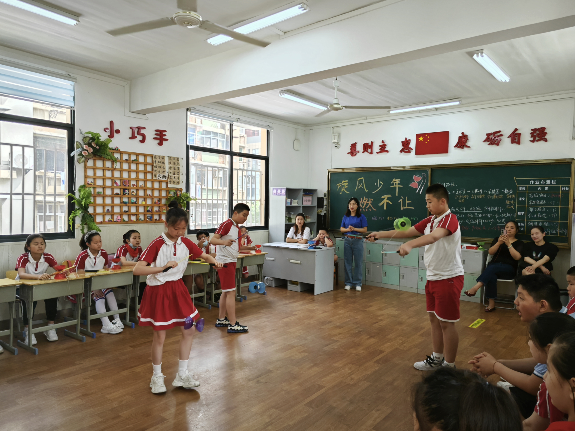 同时,老师们为孩子们准备了丰富的游园活动,23份别具特色的空竹吉祥物、用环保材料自制空竹、欣赏非遗大师秀绝活......多样有趣的环节,引得学生目不暇接。