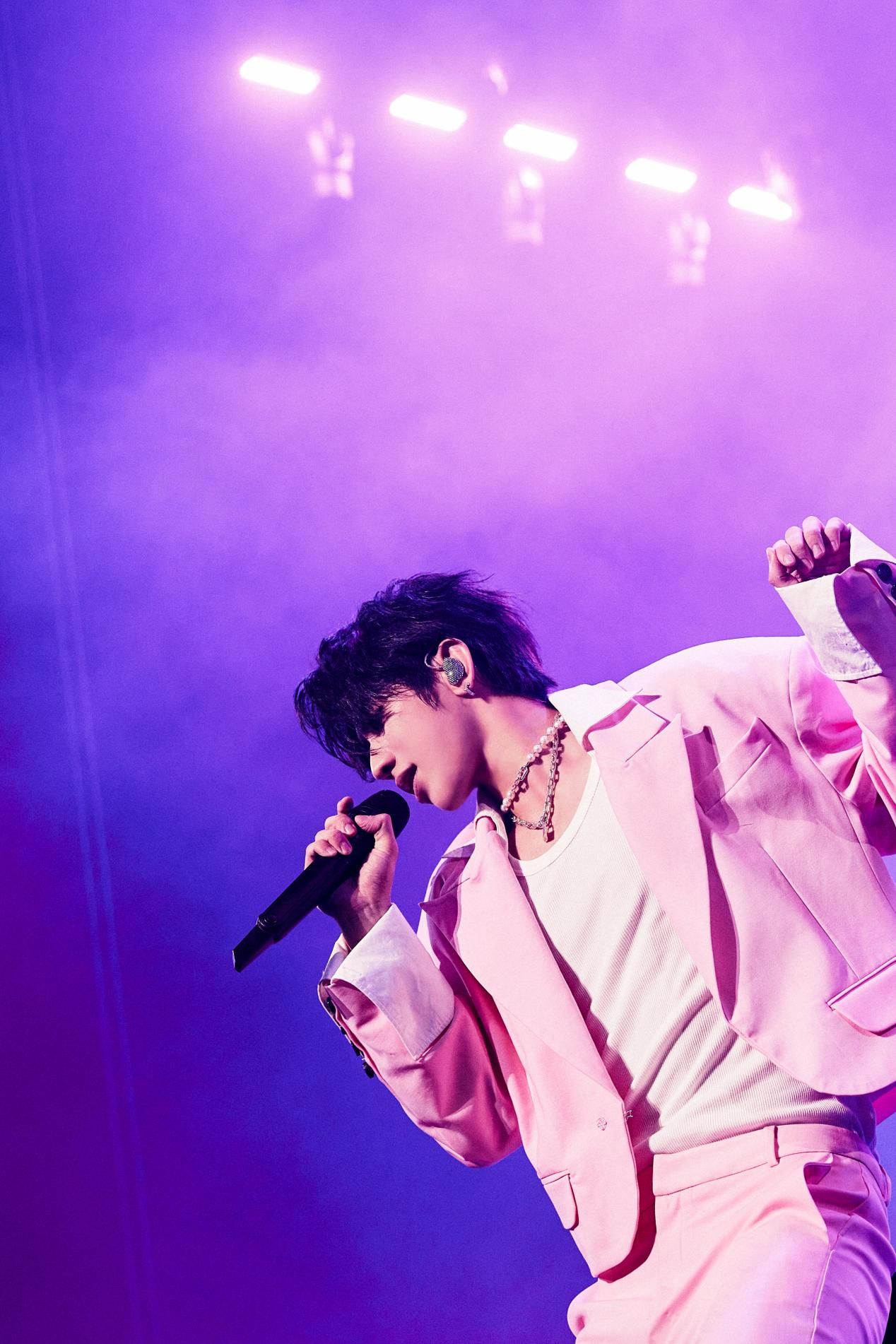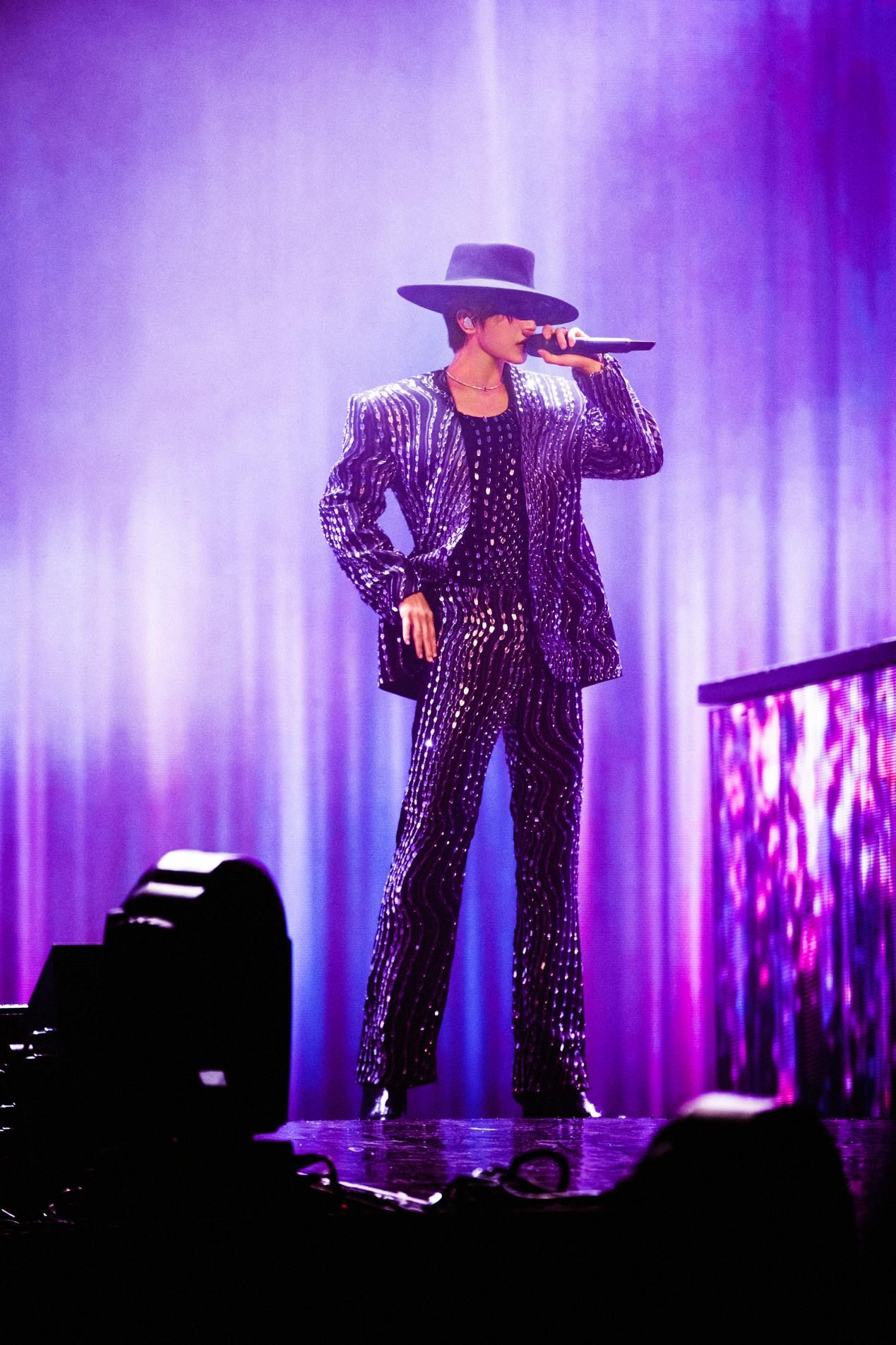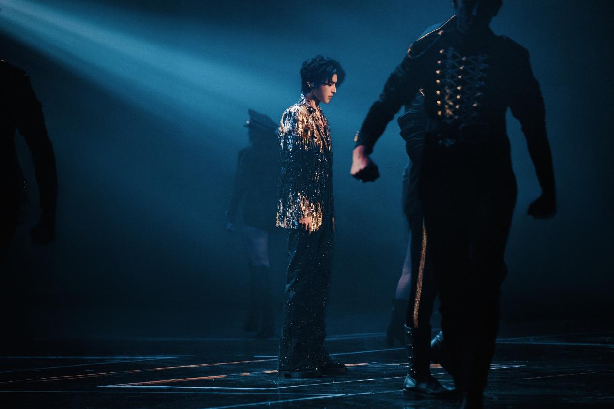 还有Thom Browne首次为国内男艺人定制的炭灰色长西装,配以白色衬衫和黑色皮鞋完成全身搭配,自然放松的传达出穿着者自身的时髦感。Act No.1定制的短款粉色西装拼接白衬衫也极具辨识度,演绎刚柔并济的反刻板印象美学。由Alberta Ferretti定制的重工亮片撞色西装,纹理质感明显,在光影下更强化了视觉感官的刺激,细节感拉满。这些量身定制的造型和舞台设计相互呼应,共同营造出一个又一个鲜活有力的视觉画面,更是丰富了蔡徐坤对舞台表演和音乐理念的独特诠释,为现场观众带来了一场无与伦比的音乐艺术盛宴。