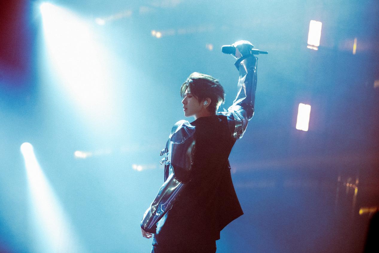 除了音乐和舞台让人叹为观止之外,蔡徐坤的演唱会造型也是精彩纷呈。量身定制的6套服装,充满了创意和个人色彩。Sho Konishi定制的金属机甲臂膀造型充满了未来感的先锋视觉,搭配摇滚与诗意并存的Ann Demeulemeester设计的黑色西装,极具异时空的超现实氛围瞬间拿捏。Ronald van der Kemp的高级定制使用了大量的真丝薄纱堆叠,诠释出粗犷与优雅的冲突感。Mugler特别定制的这件手工镶嵌4000镜片的水波纹西装更是梦回2021巡演北京站,牢牢抓住所有观众的眼球,牵动了所有乐迷的思绪。