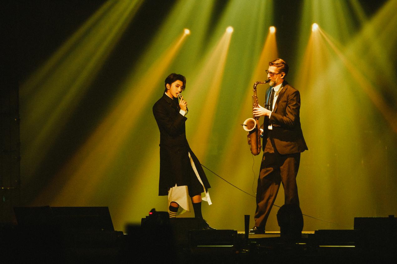 现场的爵士管乐更是成为演唱会当晚的一个亮点,蔡徐坤与乐队的完美配合令人赞叹。现场的演奏更为他的音乐丰富了层次和质感。萨克斯、小号等管乐的独特音色和精湛的演奏技巧为歌曲注入了别样的韵味,优雅的旋律和丰富音色营造出浓厚的爵士氛围,与蔡徐坤的声线和表演完美融合,这种现场演奏的实时互动为观众带来了难忘的音乐体验,展示出蔡徐坤出众的音乐才华和舞台魅力。