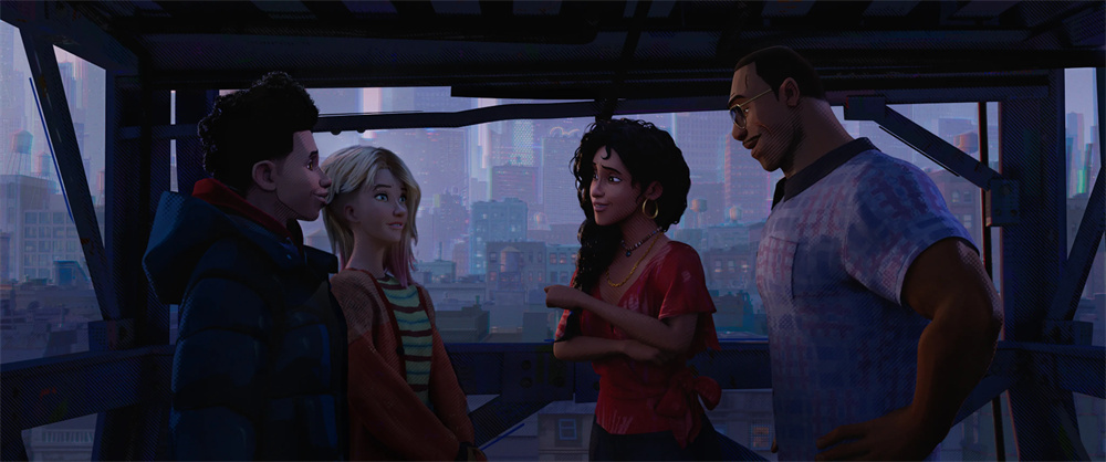《蜘蛛侠:纵横宇宙》则从“大”走向了“小”。别看本片里面登场的蜘蛛侠多到铺满整个屏幕,还有一蛛战百虫的壮观画面,但其实本片叙事的切入口很接地气。如果前作讲述的主角迈尔斯怎样战胜青春期的迷茫,认识到“能力越大责任越大”的道理,那么本作就聚焦于迈尔斯怎样面对各种外部规则给成长带来的压抑。当然,贯穿于两部电影的主题,还有家长能不能理解孩子的理想和追求,孤独的年轻人怎么样找到志同道合的朋友/恋人等等。这些内容不像漫威宇宙那么复杂,也没有DC宇宙刻意营造的“深刻”,但好就好在真诚、温情。生活化的语言和表现方式,也最容易引起观众的共鸣,可以说,本片是非常“讨巧”的。
