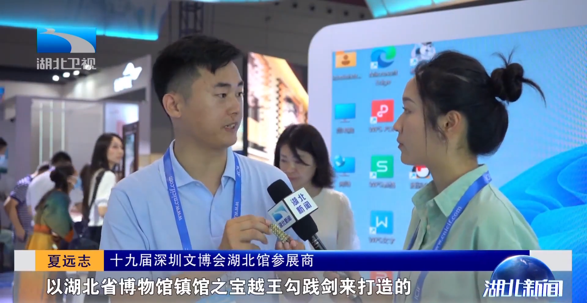 十九届深圳文博会湖北馆参展商夏远志:“这款越王勾践剑U盘就是以湖北省博物馆镇馆之宝越王勾践剑来打造的,还有像我们做的这款越王勾践剑的签字笔,曾侯乙编钟的茶具合起来就是一个编钟的造型,分开就是一个茶具。我们把湖北省博物馆历史深厚的文化藏品打造成我们日常经常会用到的各类产品,让年轻人在使用这个产品的时候能想起我们中华民族5000年的历史瑰宝。”