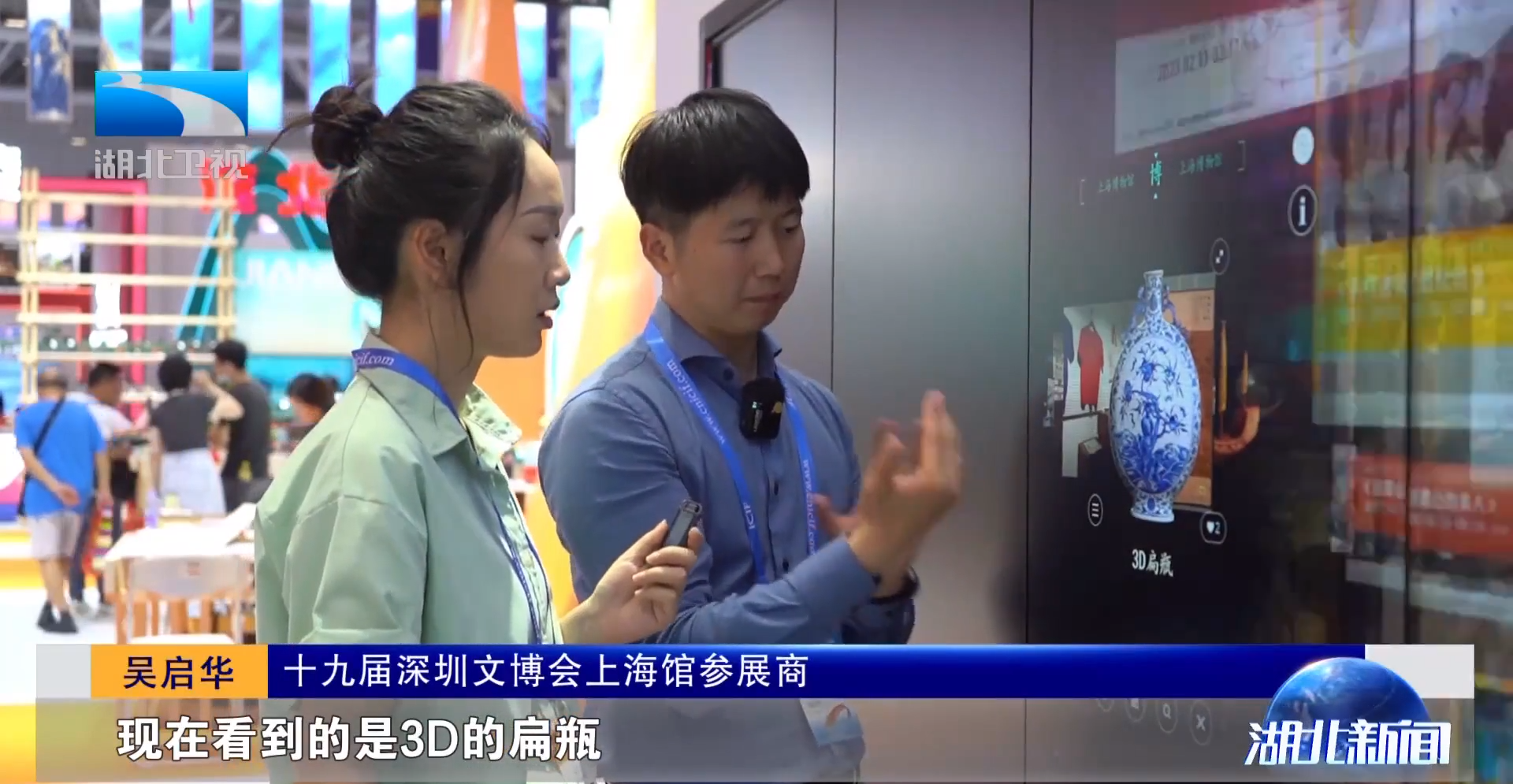 十九届深圳文博会上海馆参展商吴启华:“现在看到的是3D的扁瓶,这是收录在上海博物馆的展品,通过这个视频去全方位多角度地去看它的细节,手机去扫描这个二维码就可以手机端去看它的图文介绍,我们也是把中华民族的优秀传统文化通过科技进行创新性发展。”