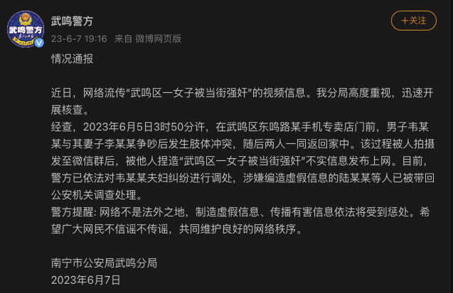 6月7日,南宁市公安局武鸣分局通报,近日,网络流传“武鸣区一女子被当街强奸”的视频信息。经查,2023年6月5日3时50分许,在武鸣区东鸣路某手机专卖店门前,男子韦某某与其妻子李某某争吵后发生肢体冲突,随后两人一同返回家中。该过程被人拍摄发至微信群后,被他人捏造“武鸣区一女子被当街强奸”不实信息发布上网。目前,警方已依法对韦某某夫妇纠纷进行调处,涉嫌编造虚假信息的陆某某等人已被带回公安机关调查处理。