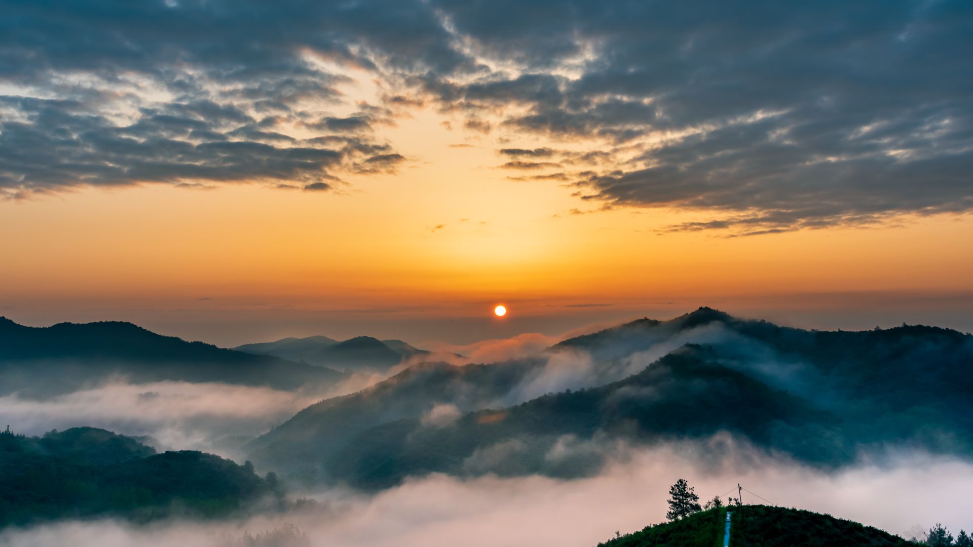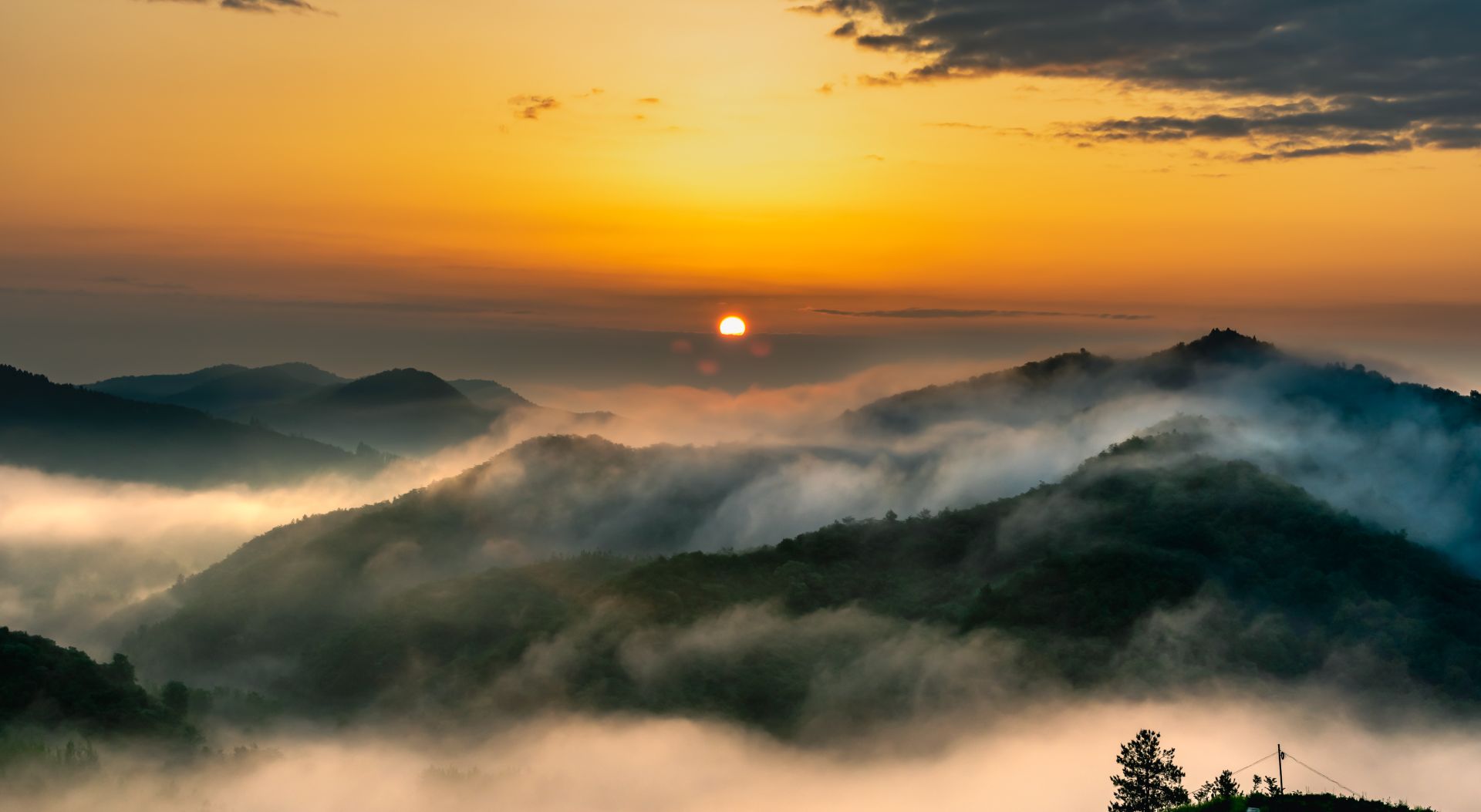 当朝阳从天边山脊缓缓升起,朦胧的山峦、茫茫的白雾、隐约的群峰,刹那间都改变了模样,山裹着金黄,云来不及躲藏,阳光穿云破雾,映射出光芒万丈。