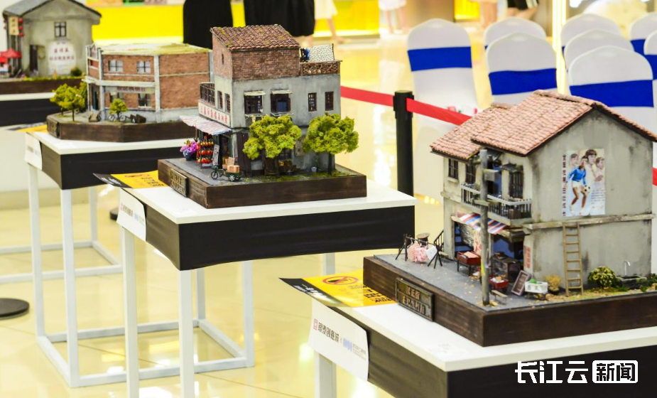 其中一组80年代汉正街商铺的微塑模型,引来不少市民驻足观看。这个作品的创作者——武汉设计工程学院2023届毕业生胡孟玲告诉长江云新闻记者:“汉正街是武汉著名的交通要道和商贸繁华地区,我们在前期考察了不少文献和影视资料,也去汉正街实地调研了当地的建筑与生活,用木结构做出了内部构造,再将瓦片一片片地铺上去,并且加上了一些叶片营造秋天的效果,整个设计花了四个月。”