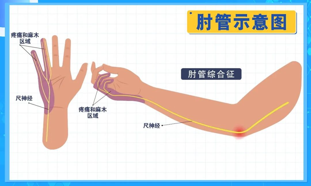 肘管综合征又称迟发性尺神经炎,是尺神经在肘部走行于尺神经沟处受周围结构卡压继而导致的神经病变。肘管属于肘背内侧的一条被软组织及韧带覆盖的管道,让尺神经通过至手臂内侧的肌肉、手掌、尾指及部份无名指。