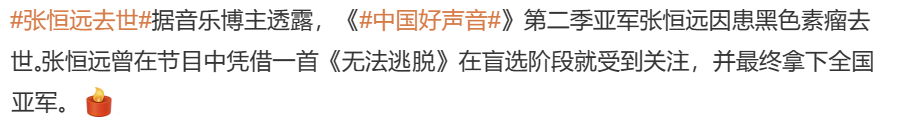 前不久一个令人惋惜的事情冲上热搜。《中国好声音》第二季亚军张恒远因患黑素瘤去世。