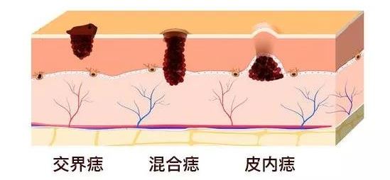 根据黑素细胞所在的皮肤层次,可将黑色素痣分为皮内痣、交界痣和混合痣。