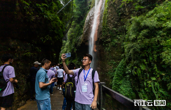 在恩施大峡谷景区,云龙地缝被称为“地球上最美的伤痕”,深近百米的云龙地缝犹如眉眼,缝中有洞,洞中有河,河中有石。而这样的喀斯特地貌奇观迅速吸引了夏令营成员的注意,除了感叹其奇异独特外,大家还现场探讨地质形成的原因、分析天气气候等因素对植被生长带来的好处,景区中掀起了一股“学潮风”。