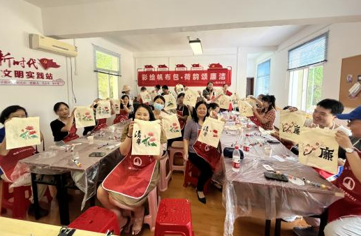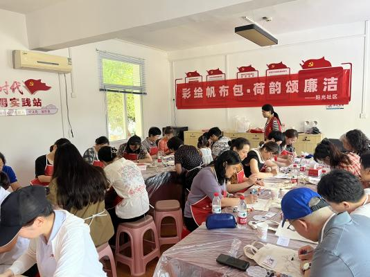 云收雨过波添,绿树阴垂画檐。在这绿意盎然、碧空如洗的盛夏时节,为进一步推进社区清廉文化建设、丰富居民的精神文化生活、锻炼他们的动手能力与学习能力,武汉市洪山区关山街道阳光社区新时代文明实践站于7月26日上午为辖区居民开展了“彩绘帆布包·荷韵颂廉洁”的包包制作活动。莲花者,谐曰“廉花”,廉洁之花也;包上的莲花仿佛活了过来,摇曳跃动,为夏日吹进一丝清风正气,也预示着接下来的生活好运“莲莲”。