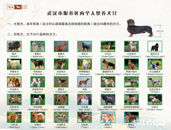 武汉市江岸区、江汉区、硚口区、汉阳区、武昌区、洪山区、青山区、武汉经济技术开发区、武汉东湖新技术开发区为限制养犬区,限养区内禁止无证养犬。限养区内个人养犬,每户只准养一只,且禁止养烈性犬和大型犬(身高45cm以上)。