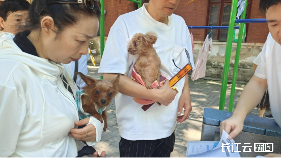 7月27日起,武汉市开展统一规范养犬宣传暨办理养犬证活动。10时许,长江云新闻记者在武昌区胭脂路某社区广场看到,犬证办理工作台已经被居民团团围住,不少户主带着自己心爱的柯基、博美、约克夏、泰迪前来办证。
