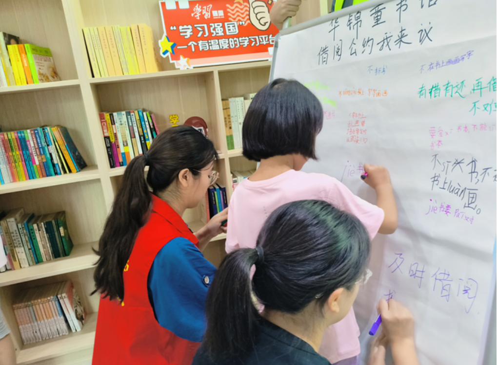 “我觉得不能乱涂乱画”、“我觉得要按时归还”……7月20日下午,华锦童书馆内童言妙语声此起彼伏,原来是童书馆志愿者正在组织前来阅读图书的青少年开展“童言”议事会,议事会主要是制定图书借阅公约。青少年们你一言我一语,志愿者根据大家提的建议从“借阅、阅读、归还”三个方面进行归纳提炼,最终形成朗朗上口的借阅公约顺口溜,让青少年们将借阅公约铭记于心。