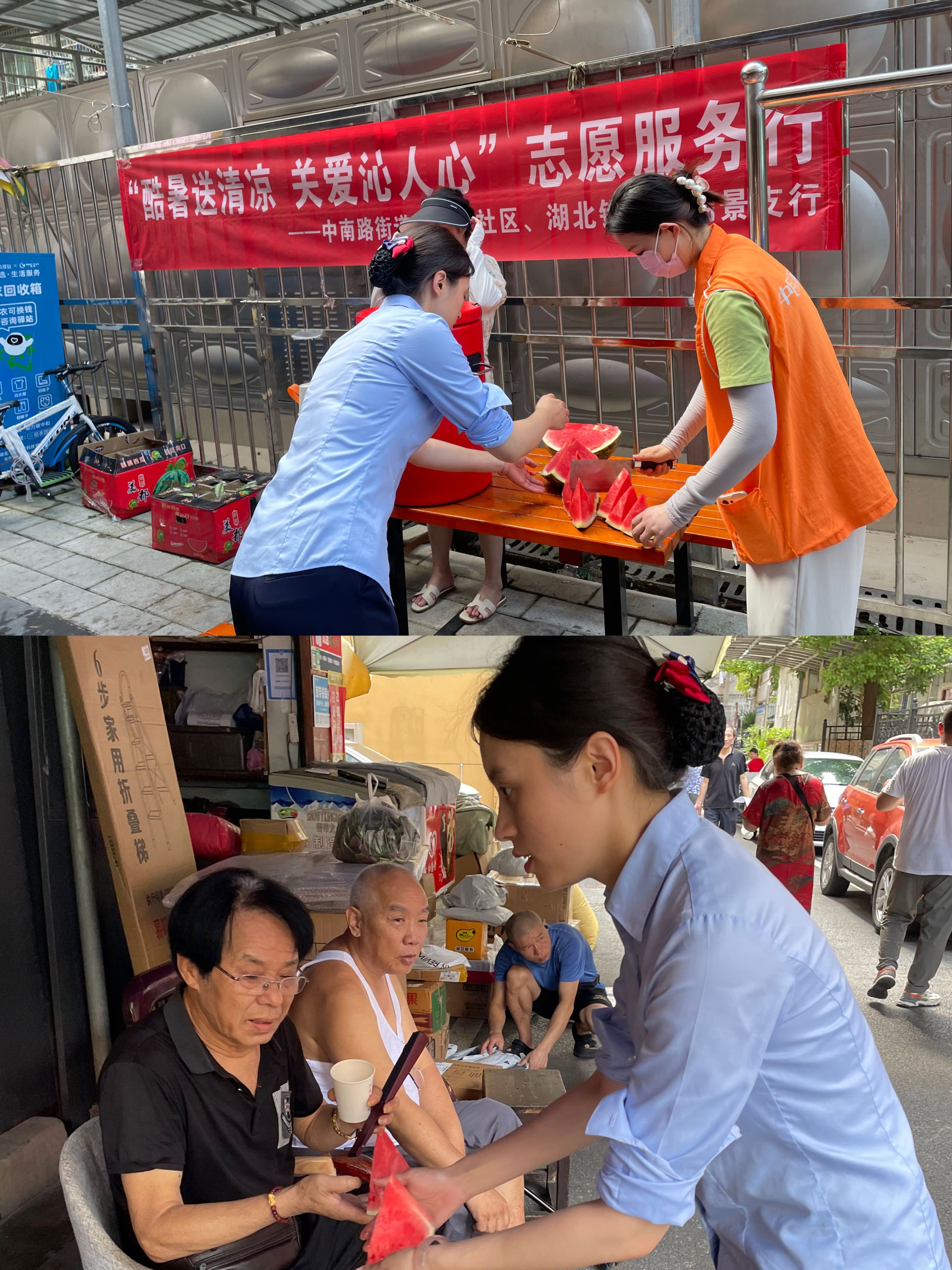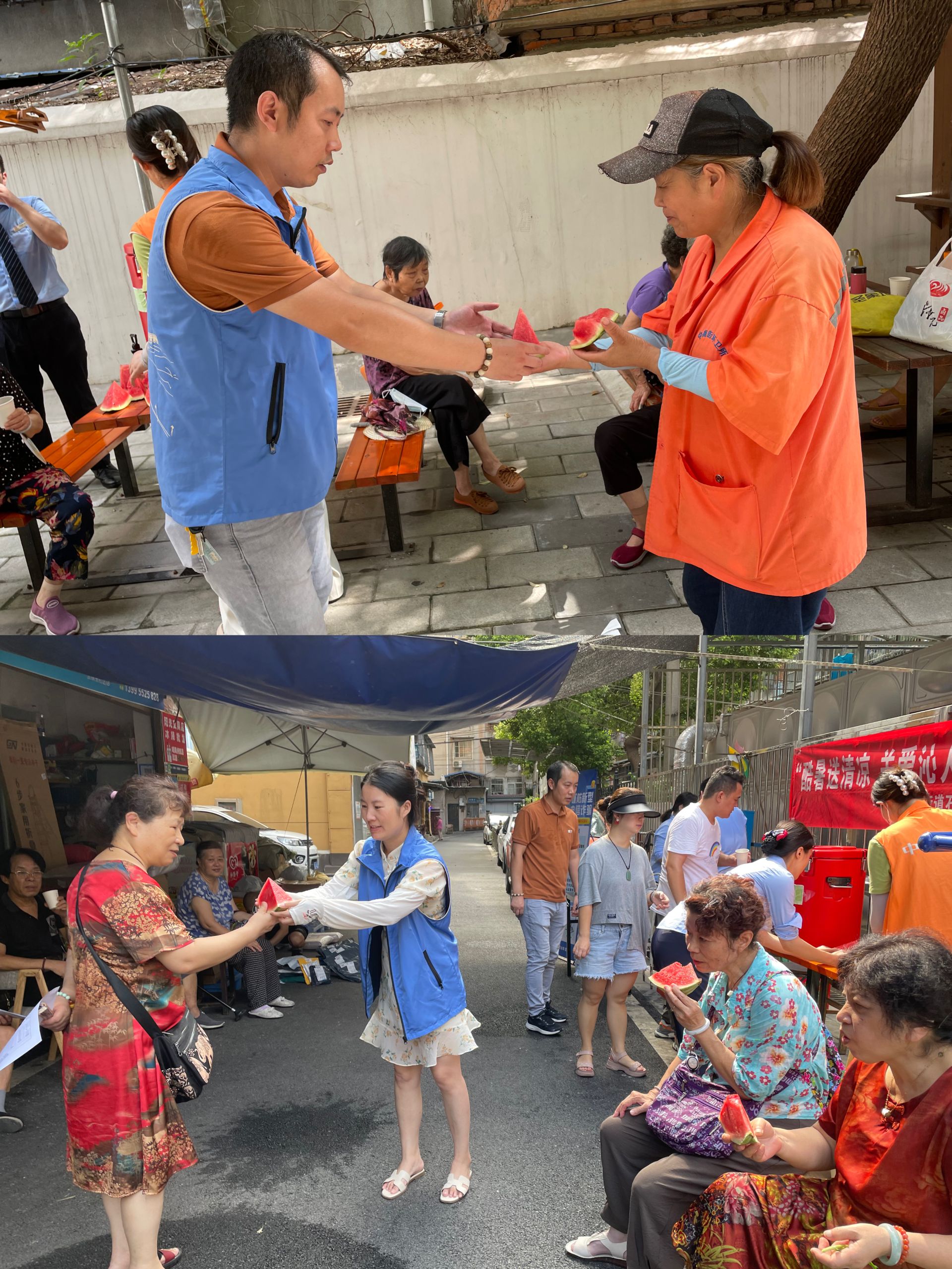 活动当天,社区还在各个居民小区的公共阴凉处设置了防暑降温点,准备了西瓜和酸梅汤,分发给附近的快递员、环卫工人、辖区老人等,并为他们科普防暑降温知识。“这酸梅汤蛮甜,生津又止渴,舒服呀!”环卫阿姨郭师傅开心地说。