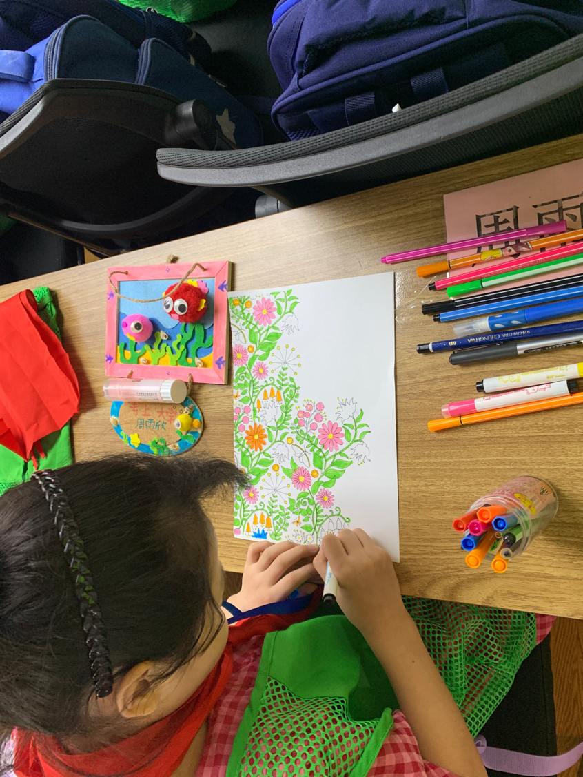 涂鸦课中,小朋友们纷纷拿起画笔,画出自己眼里的世界:棕色的玫瑰花、黄色的叶子与绿色的叶子出现在同一棵树上、爱心形状的云朵飘在半空之中、鱼群在天空中飞翔……完成画作后小朋友们又滔滔不绝地向老师讲述着自己的想法和思路。