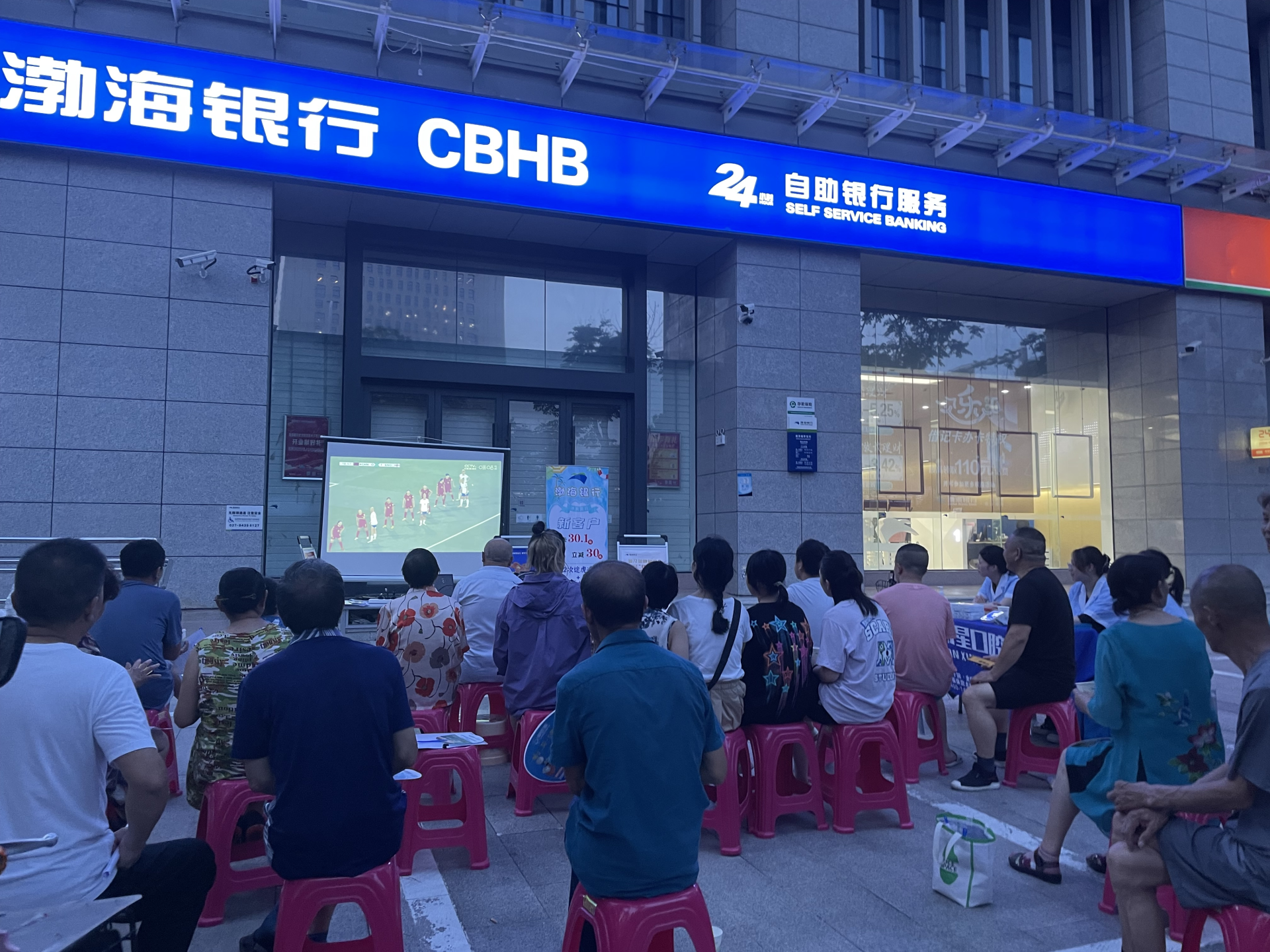 晚7点,居民就聚集在渤海银行搭建的露天幕布前,等待比赛的开始。在一阵阵欢哨声中,比赛正式拉开帷幕,现场球迷越聚越多,都目不转睛地盯着大屏幕,为中国队加油!球场上球员的一举一动都牵绊着现场居民球迷的心。大家时而欢呼时而紧张,居民程女士表示:“一个人在家看球没气氛,露天看球才过瘾。”