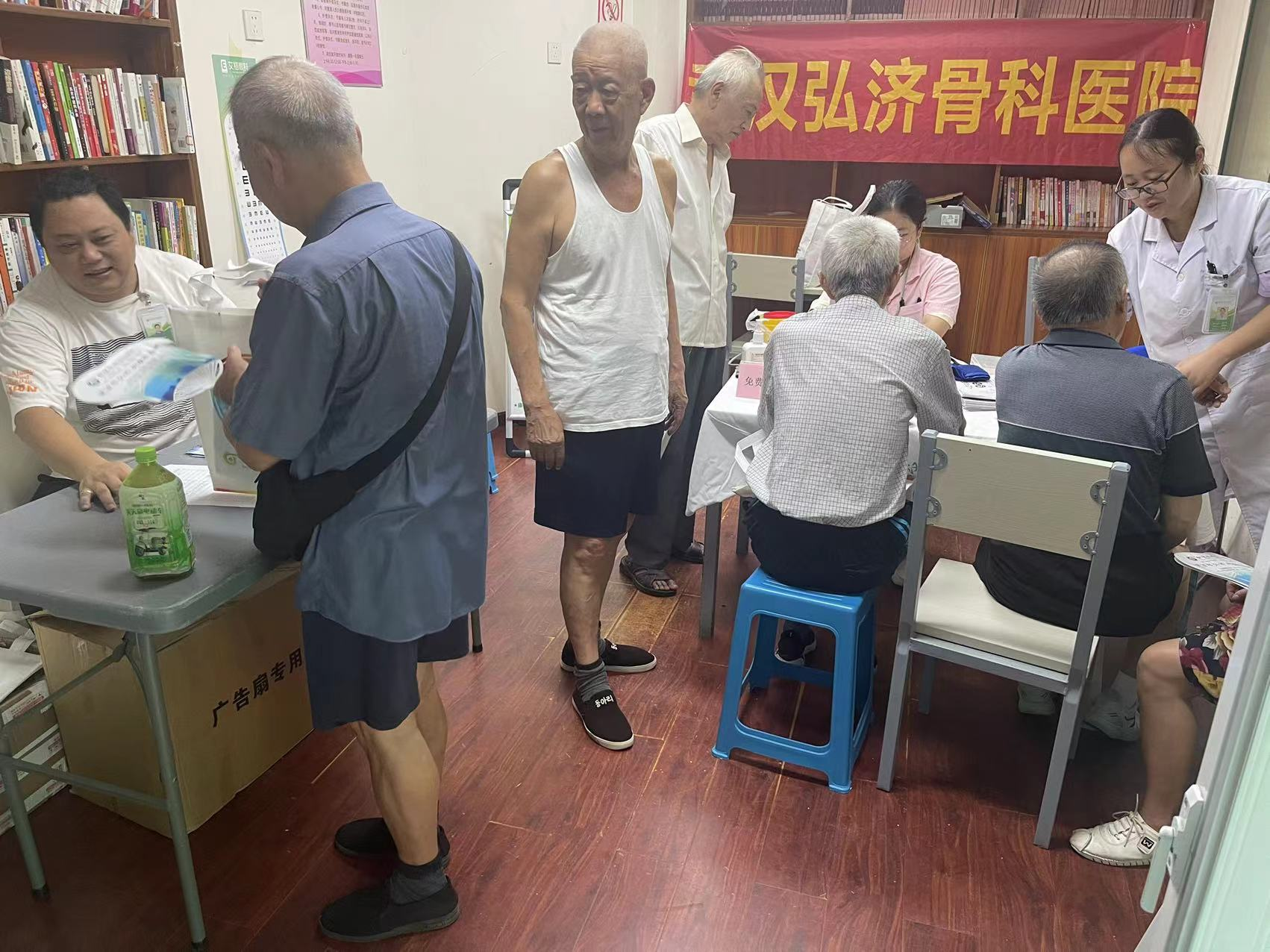 拍摄活动结束后,在蔡家田小区中心花园内,由武汉艾格眼科医院、武汉弘济骨科医院的医生们为辖区退役军人开展了眼部及骨科义诊活动,向大家讲解了在炎热的夏季中,如何保护好眼视力和膝关节、痛风等注意事项,并为到场的退伍军人提供了精心准备的小礼品表示慰问。