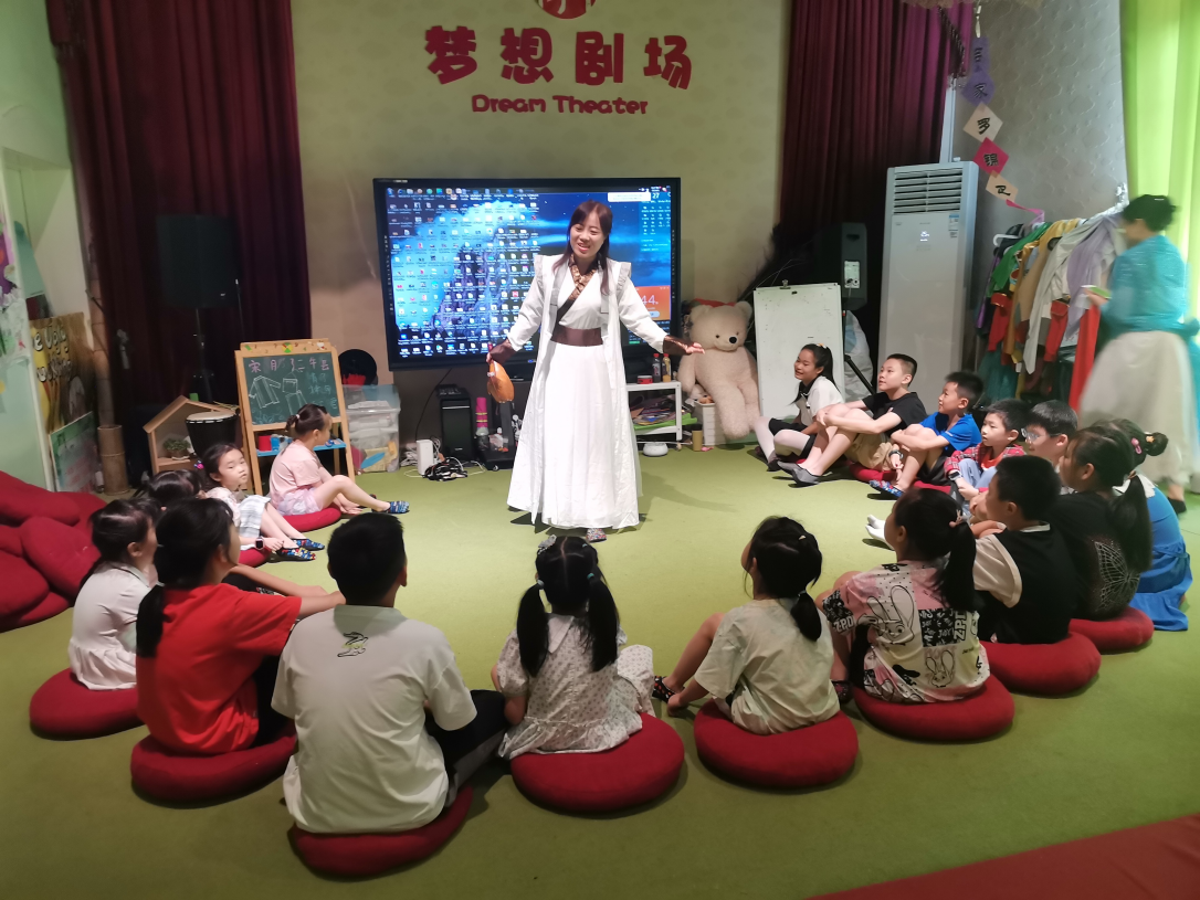 “君不见黄河之水天上来,奔流到海不复回。”在梦想剧场,志愿者老师身着一袭长袍,化身诗仙李白,带领孩子们走进诗人眼中的水世界。“月下飞天镜,云生结海楼;仍怜故乡水,万里送行舟。”孩子们情不自禁跟随老师一起吟诵,用手作杯,开怀痛饮。