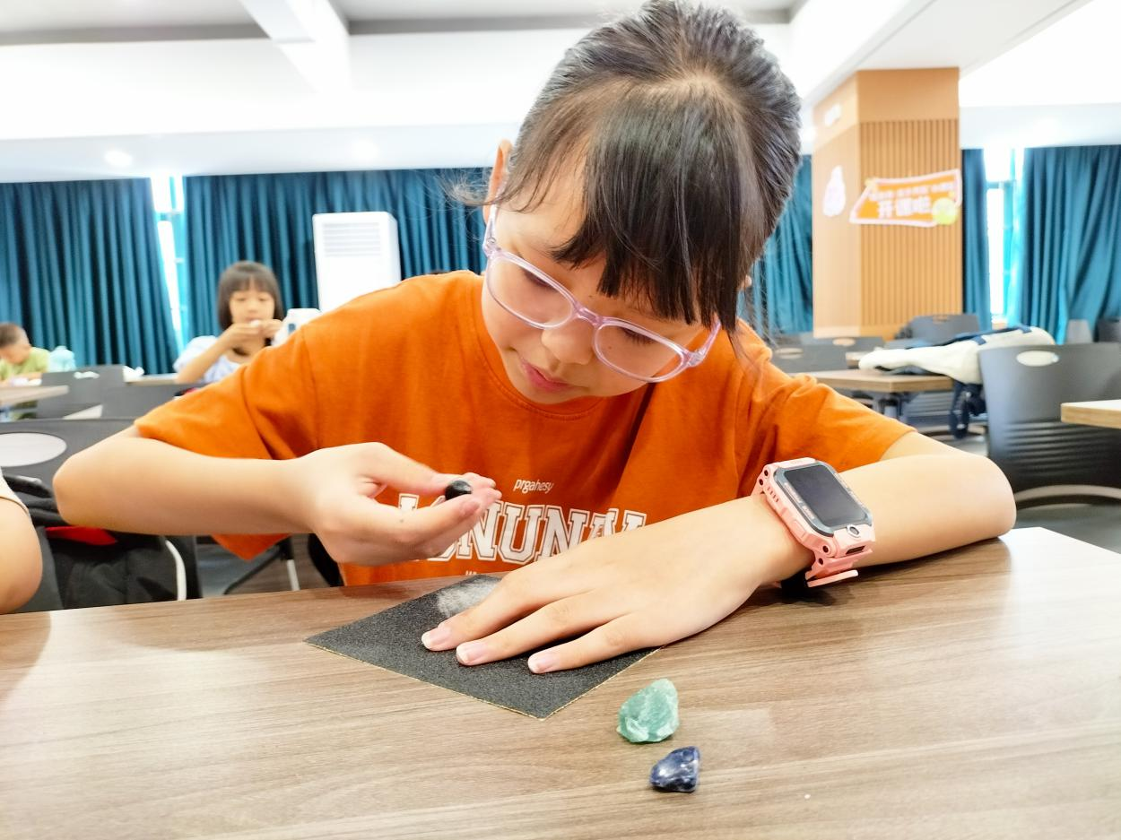 在手工制作的课堂上老师以“为什么是宝石大“磨”王呢?”这一问题开始了课程,小朋友们踊跃回答,有的说是宝石都是磨出来的,有的说是宝石都是加工后的产品,老师为大家介绍了宝石的定义,宝石的力学特征,生活中常见的宝石的特点,还与小朋友们一起探索了宝石的前世今生。老师讲故事的环节结束后,是小朋友们的动手环节了,用萤石、砂纸、铜丝、项链绳制作一条属于自己的萤石项链。小朋友们拿到萤石和砂纸就迫不及待地开始打磨了,有的小朋友磨成圆的,有的小朋友磨成棱柱形,老师的帮助下,小朋友们的萤石项链都做好啦!