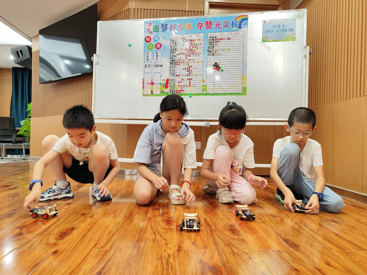 在农耕时代,聪明的农民使用风车去除水稻等农作物中的杂质,瘪粒,秸秆屑等。而随着科技与时代的进步,风车的作用已经不止如此了,风力发电是如今新能源中的大头,风车已经给人类的生活带来了许多便利了。在科技手工课堂上,老师给大家讲解了风车作用的演变和历史,从最开始只能作用在农业上的风车到如今可以用来发电以及驱动大型的工具,风车也随着时代的变迁在进步。孩子们也纷纷补充风车的作用,充分展示了新时代少年儿童丰富的知识储备。在老师的指导下,带着对科技的新认知和学到的风车相关的知识,孩子们先后完成了自己的作品,一个个风力车被拼装了出来,随后大家展开了激烈的比赛,现场气氛活跃,大家把风力车排放整齐,打开开关进行试验,只见风扇叶片快速旋转,通过风力作用小车开始前进,小朋友们欢呼雀跃。