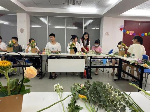 社区工作者带领青少年以家庭为单位进行比拼亲子互动游戏,考验家长与小朋友的默契之外还考验大家的合作意识。插花老师给大家讲授插花的基本流程,以及根据现场花卉的色彩进行搭配讲解,小朋友认真地听着时不时摇头晃脑,大人们则频频点头。