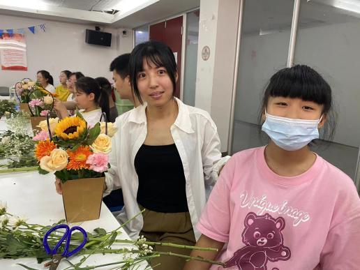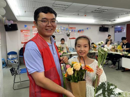 “这朵小雏菊真好看!”“我这朵康乃馨也好看,我妈妈最喜欢了。”“我妈妈喜欢玫瑰花,白色的!”一声声稚嫩又欢快的声音充斥在中大社区这栋小楼里。