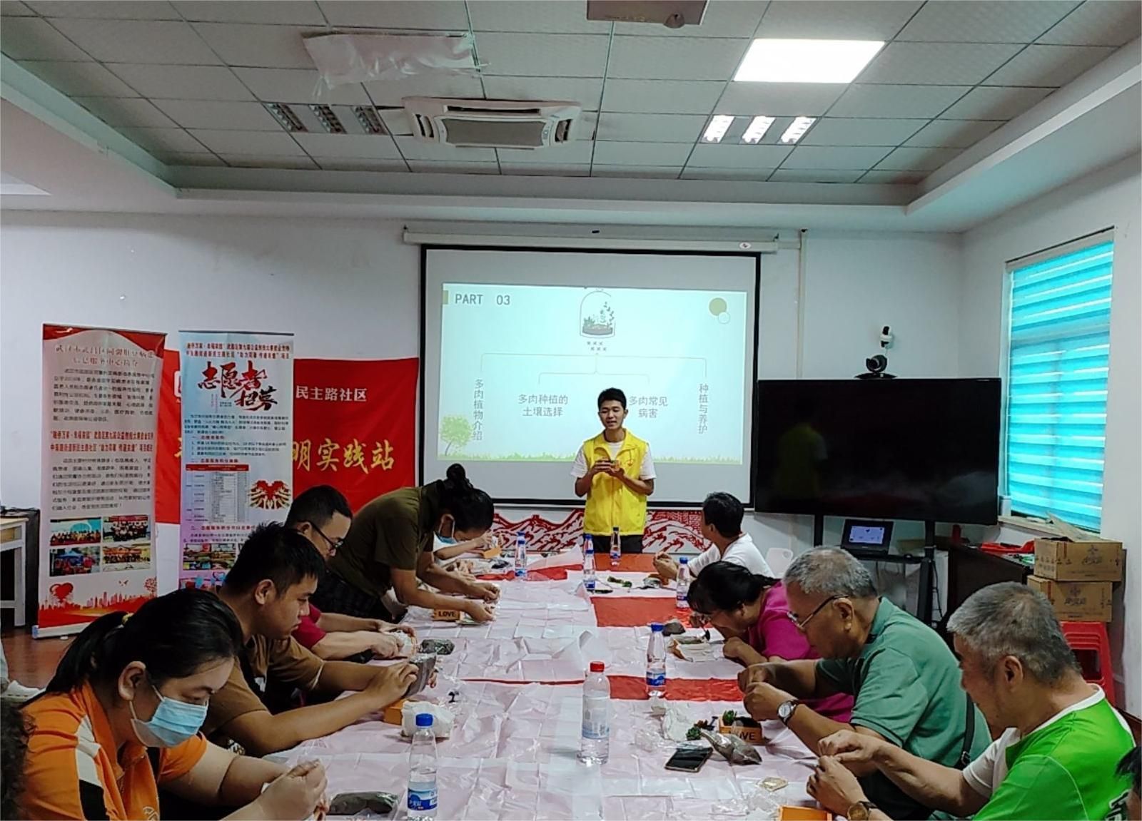 在现代生活中,心理疗愈和解压成为心理亚健康的必要需求,为了让特殊困难群体通过园艺疗法来缓解生活压力,2023年8月4日下午,武汉市武昌区中南路街道新民主路社区联合中南路街道社工站、武汉市武昌区同馨肝豆病患信息服务中心,在新民主路社区二楼多功能会议室开展了一场以特殊困难群体为主体的“指尖造绿植多肉,生机盎然暖人心”园艺健心减压关爱服务活动,共15名特殊困难群体参与了本次活动。