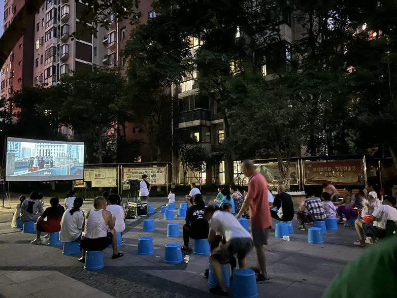 8月4日,正值高温酷热,电影放映站的工作人员早早赶到了社区放映点,在社区志愿者协同下,做好电影放映前的准备工作。虽说天气炎热,但丝毫没有影响居民观看电影的热情。大家纷纷围坐在大幕布前,共同观看电影。