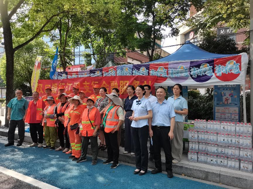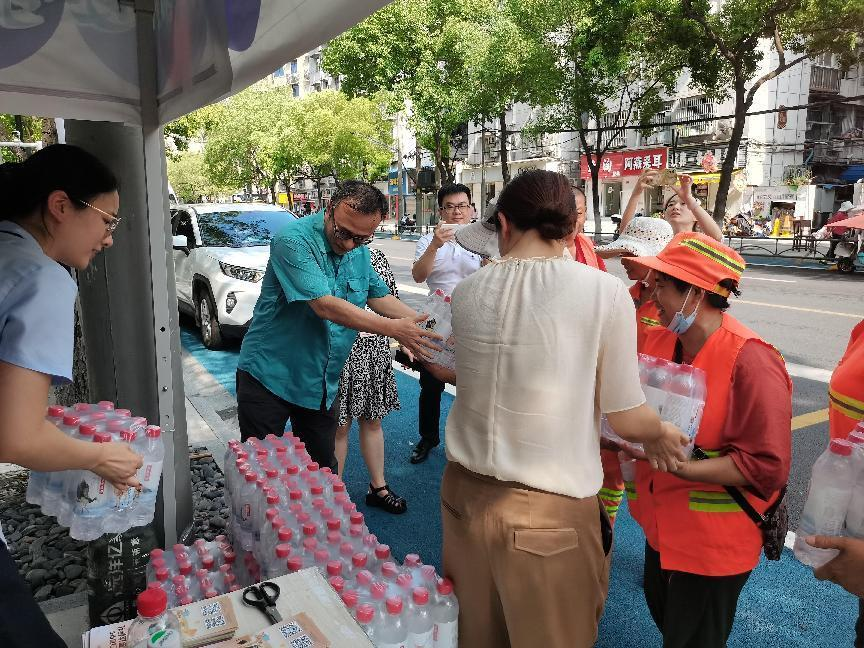 没完没了的高温,武汉市江汉区汉兴街道杨汊湖社区的工作人员艰苦奋斗,按照规定时间仍然坚守街头阵地,为户外工作者和有需求的市民送清凉,商会企业会员单位深受感染,慷慨解囊,纷纷参与送清凉活动。8月7日下午,汉口银行主动联系了汉兴街道商会来到了杨汊湖社区在街头设立的户外一线劳动者服务站——清凉亭送水点,送来了解暑物资。