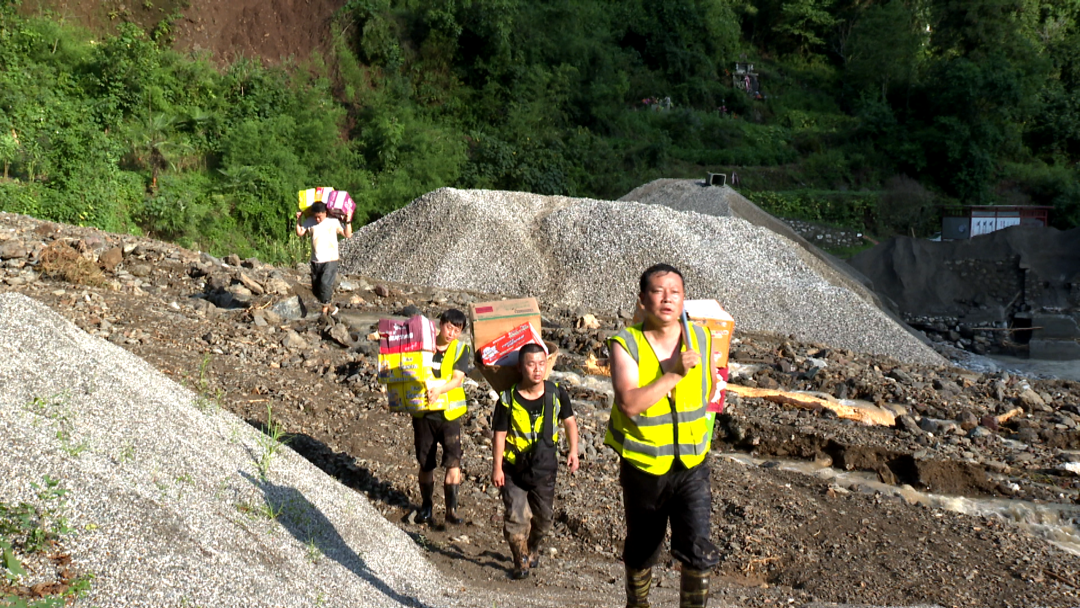 咸水村位于古夫镇西北部,山高坡陡。平时仅需20分钟的路程,记者一行乘车、换轮渡、徒步近1个小时,才到达咸水村二组的中转站。从中转站到村委会,还要步行大约2小时,且路面受损情况更严重。目前,回村路上的桥梁已经冲断,只能从山上绕行,常人根本无法通行。救援队伍只能依靠绳索牵引,艰难前行,运送救灾物资。