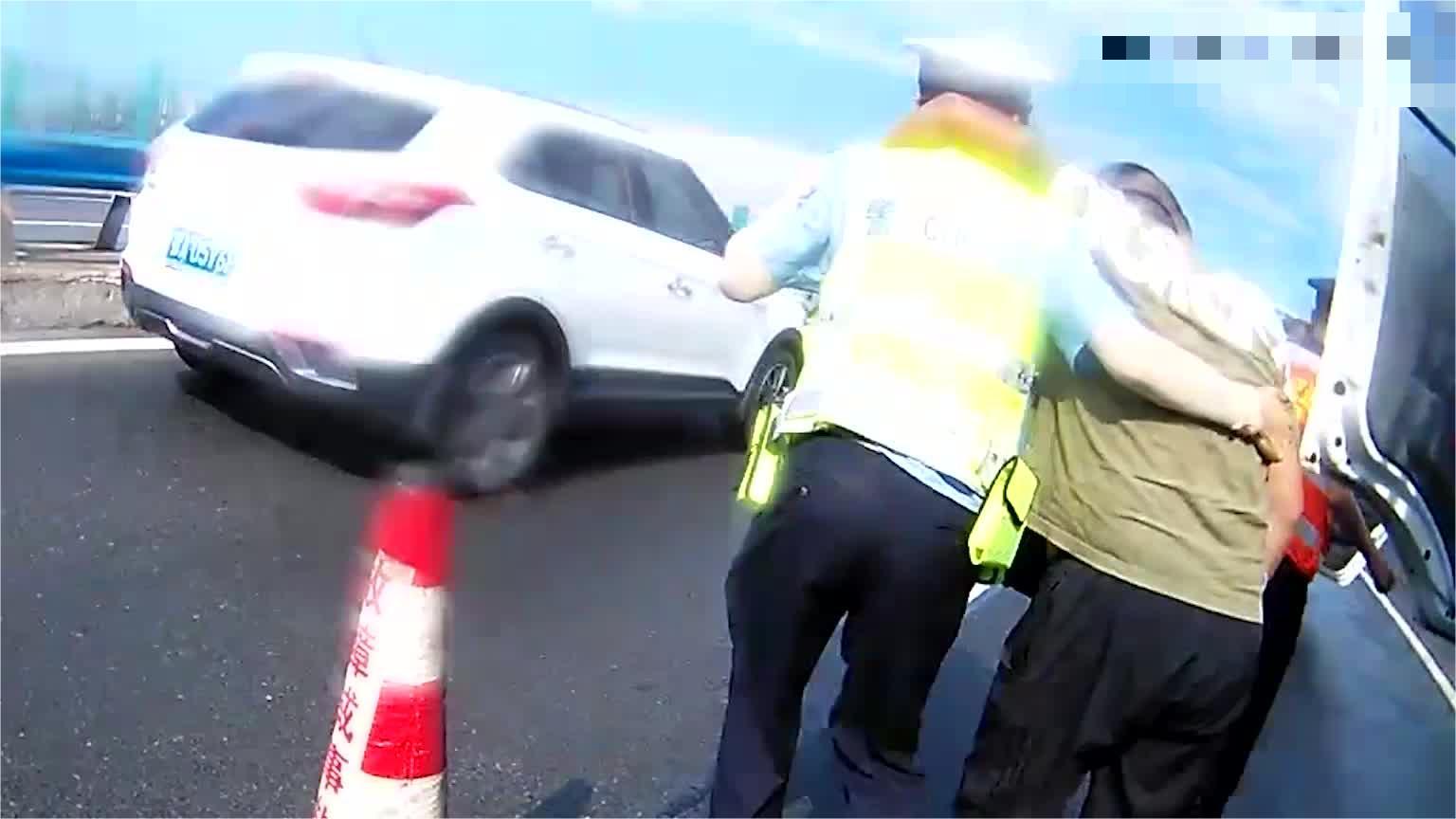 就在这时,正在对向联动巡逻的施救人员发现了这一险情,于是立即摆放锥桶,设置警示区域,并上前查看司机情况。巡逻民警看到该车司机满头是汗地趴在方向盘上,动弹不得,并且也无法交流。随后,高速警察和路政人员合力将司机搀扶着转移至警车里。