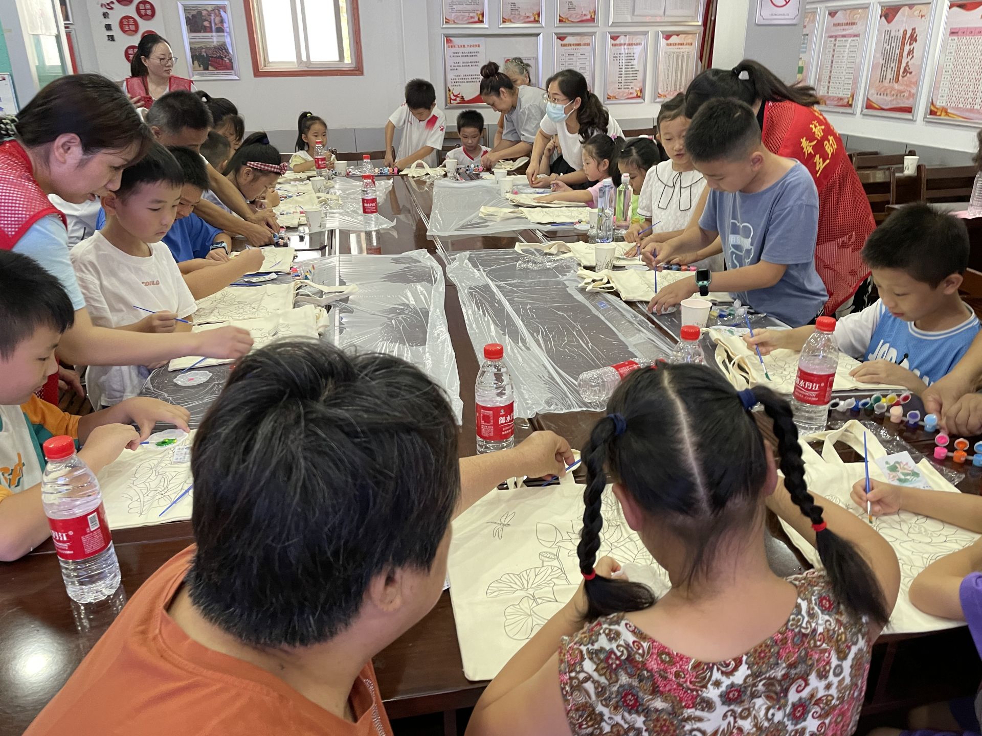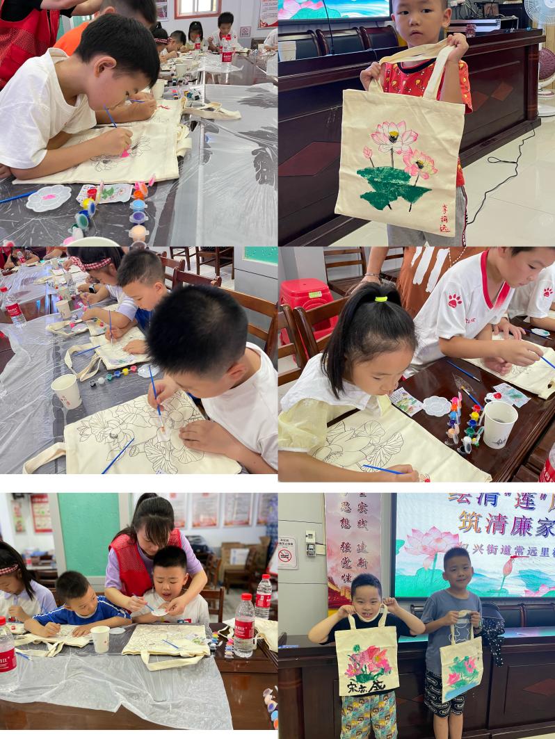 在帆布包绘制环节,孩子们热情高涨,纷纷拿起画笔,发挥自己的创意,将荷塘月色的美景绘制在帆布包上,从莲花的叶子画起再到花瓣,一瓣、两瓣、三瓣……画面渐渐丰满了起来。他们用手中稚嫩的画笔,发挥出自己的想象力,一幅幅“廉”画就制作好了。