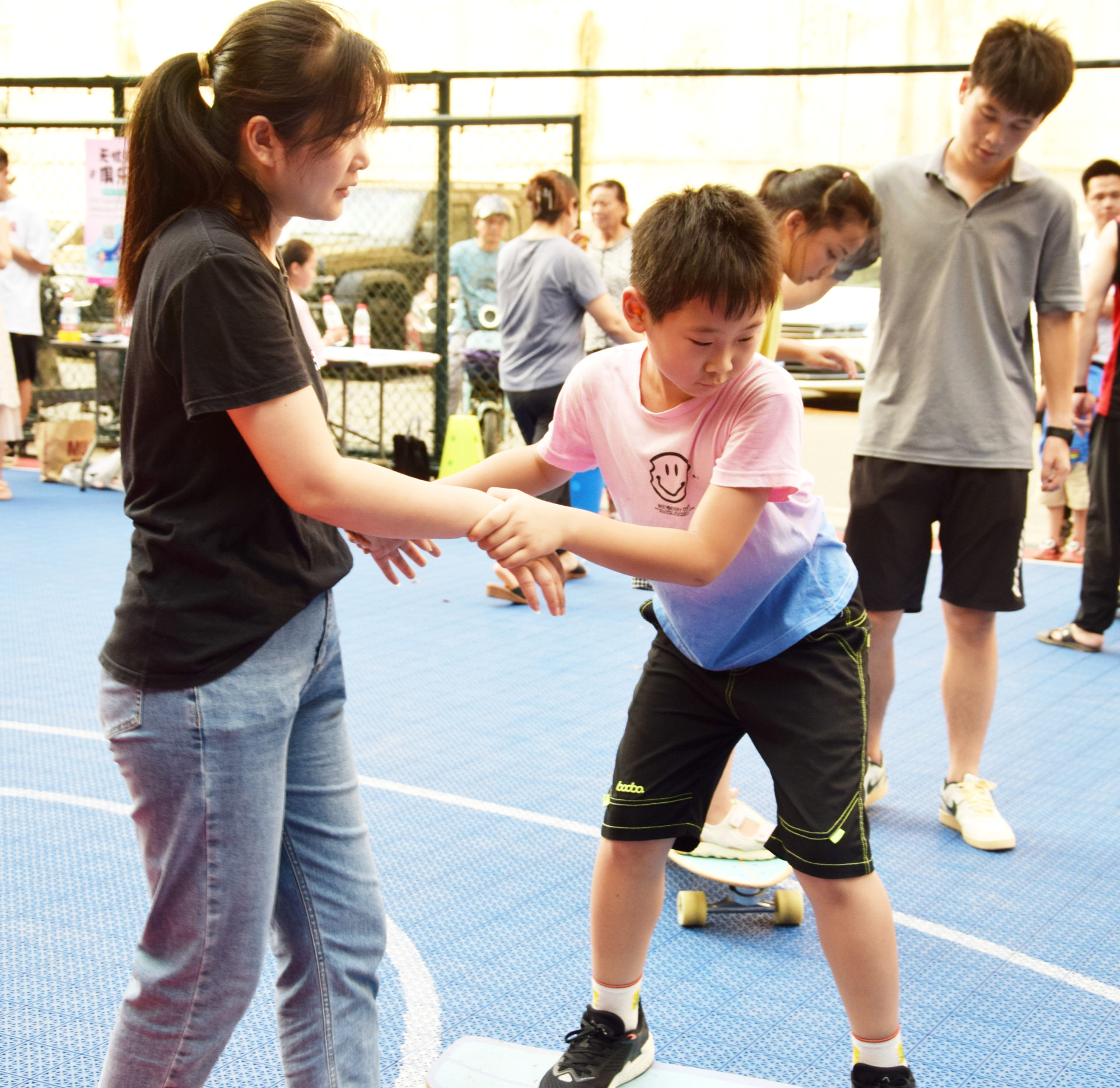 活动现场,老师带着孩子们做趣味热身活动,讲解滑板的相关知识以及初学滑板的一些注意事项,并手把手教授滑板的基本操作和技巧,耐心地解答小朋友们提出的问题。在老师的耐心指导和家长们的帮助下,孩子们很快找到重心,在滑板上站稳,并在扶持下开始慢慢滑行。