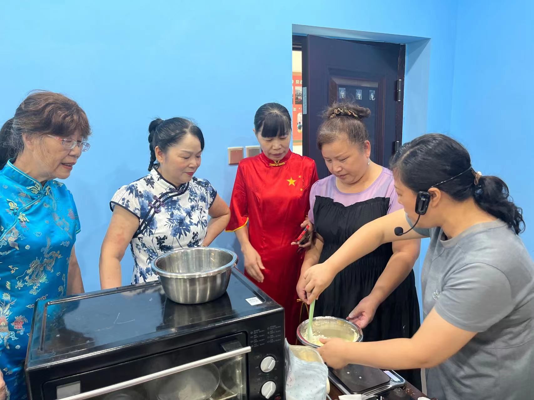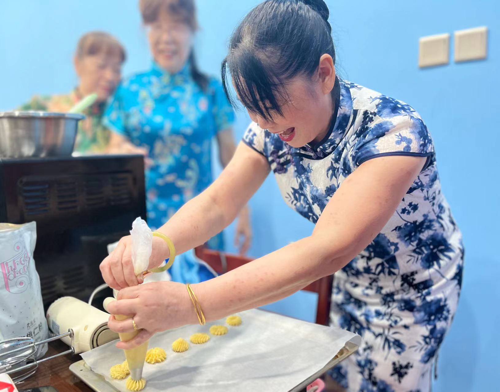 品茶之余,另外一边烘培老师又给大家穿插讲解了烘焙的有关知识,亲自做示范,为大家逐步讲解制作、烘焙要点,并示范了烘焙曲奇饼干的完整过程。从打发黄油、掺入蛋液、加入低筋面粉和糖粉,借助裱花工具压成各种形状,直至烘烤成熟,志愿者们听得无比认真。换志愿者们上手制作了,在老师的授教中,一个个色彩金黄的曲奇逐渐成型,烘培的曲奇饼香气蔓延到整个活动室。随即大家都品尝到了自己做的曲奇饼,体验到了烘焙的乐趣,更感受到了同心协作的情谊。